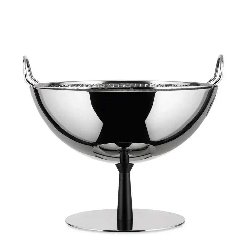 Alessi AC04 B 鋼製水果碗/濾籃,底座為無煙煤色 將一個平凡的廚房必需品轉變為引人注目的設計物件。它既極簡又富有表現力,兼具雙重功能:一個容量達150毫升的可靠濾籃,以及一個精緻的水果或蔬菜展示器,適合擺放於餐桌上。其鏤空結構提供良好的透氣性,而無煙煤色底座則以對比和優雅穩固了整體造型。