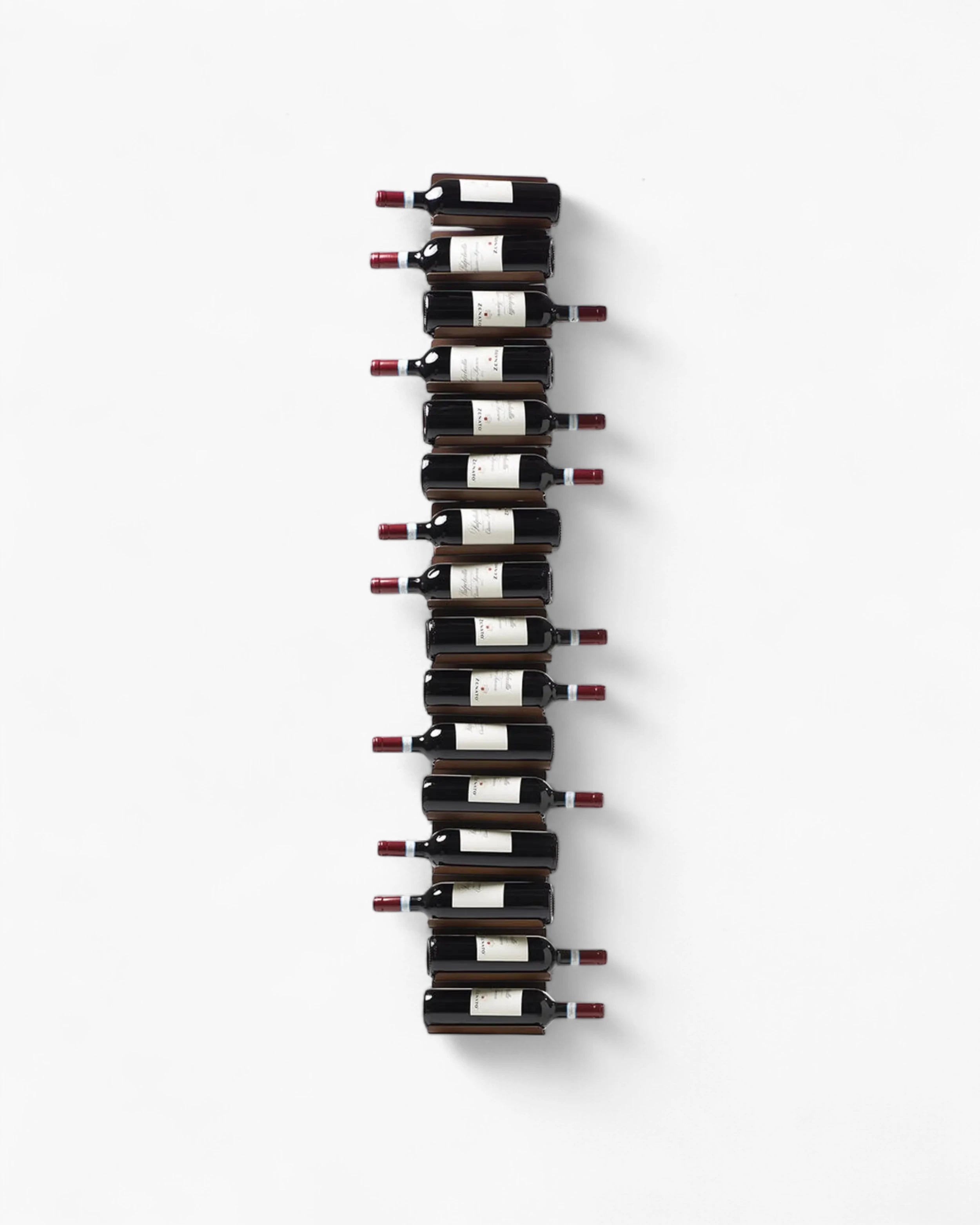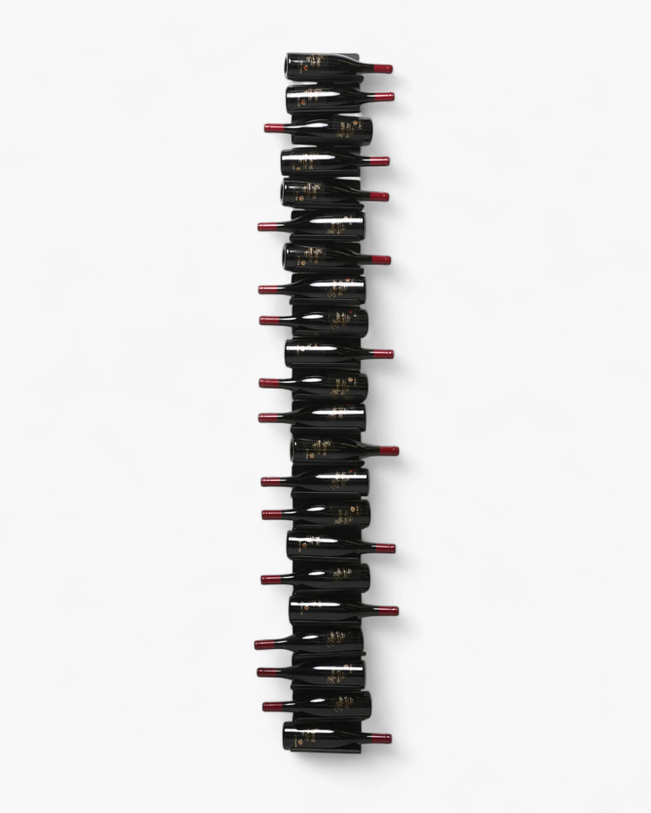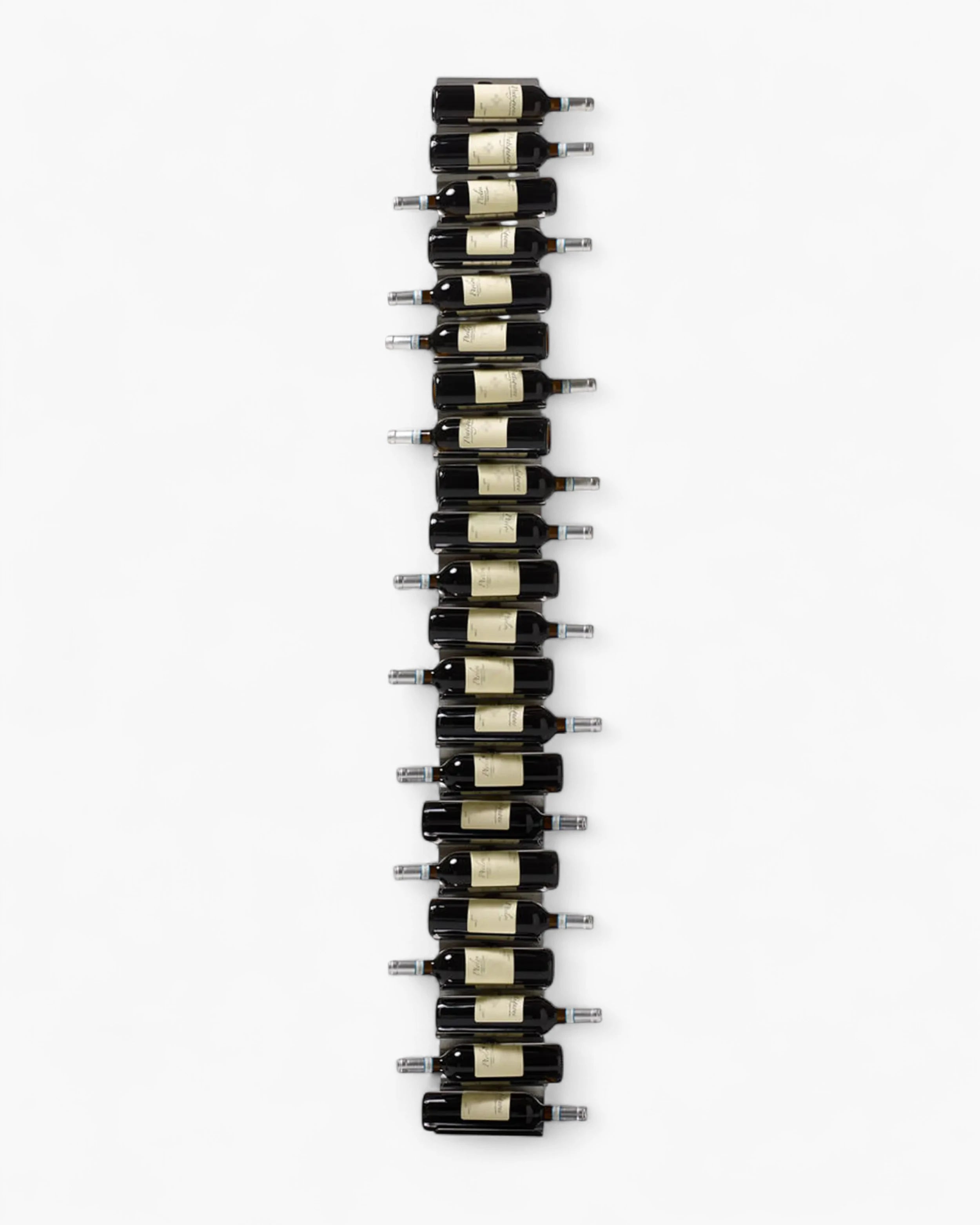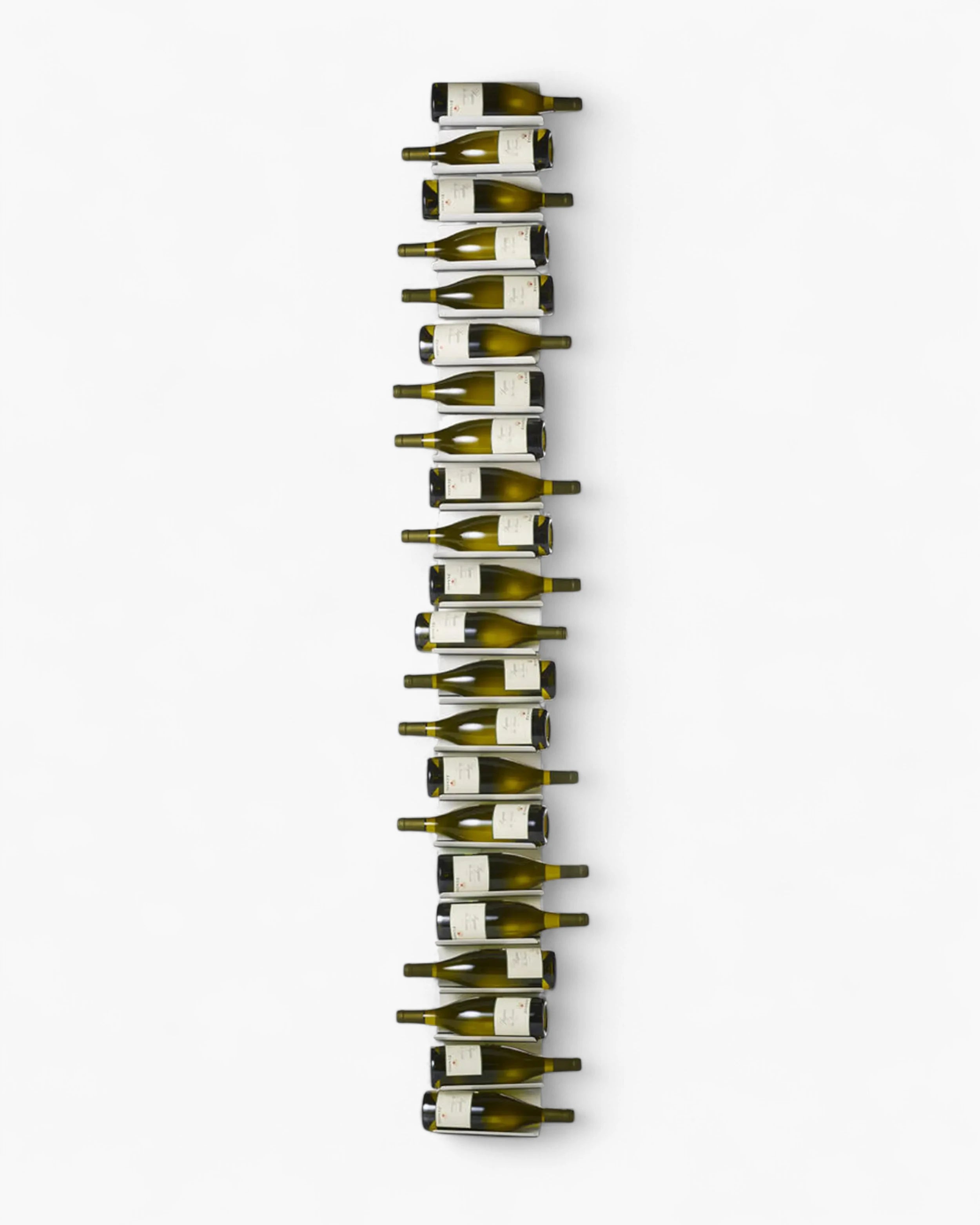 這款壁掛結構採用堅固鋼材製成,提供卓越穩定性,同時保持乾淨、簡約的輪廓。其層板配備可清洗的防滑彈性帶,確保每個酒瓶穩固安全。提供三種不同尺寸,依配置可容納 8 至 22 瓶,且因其模組化特性,允許無限組合。這是一個多功能解決方案,適用於不同類型的葡萄酒瓶,確保妥善存放與陳年,同時節省寶貴的地面空間。