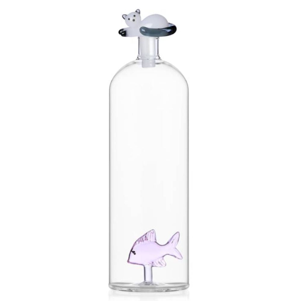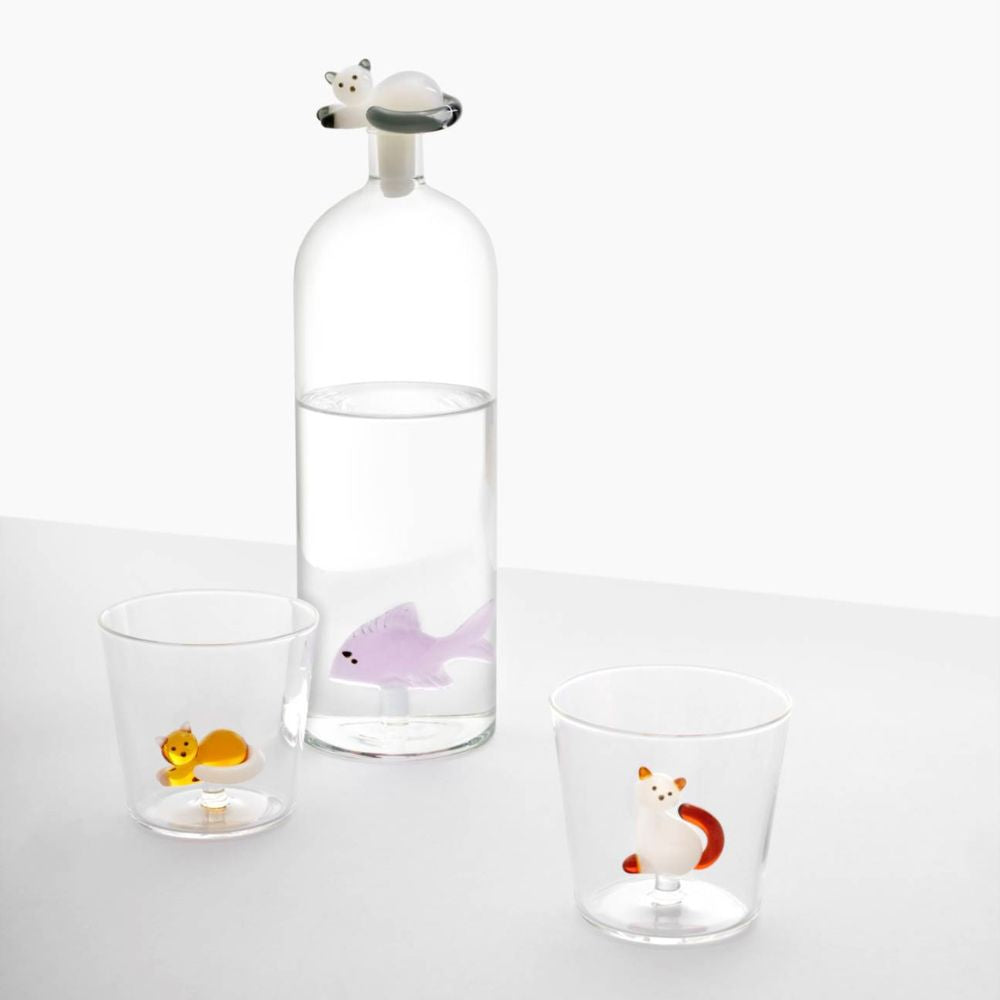 This bottle by Ichendorf is shaped in handmade and lampworked borosilicate glass, a material chosen for its clarity, lightness, and exceptional resistance to temperature variations. This craftsmanship gives rise to subtle volumes and clean edges, allowing the miniature figures inside to appear suspended as if captured in a moment of gentle stillness. The Tabby Cat Collection’s characteristics specify its suitability for alimentary use and low-temperature dishwasher cycles, although the precision of its internal elements makes careful handling advisable. Each detail, from the fish’s soft pink hue to the white cat perched within, reveals the precision and charm typical of Baldereschi’s imaginative language.