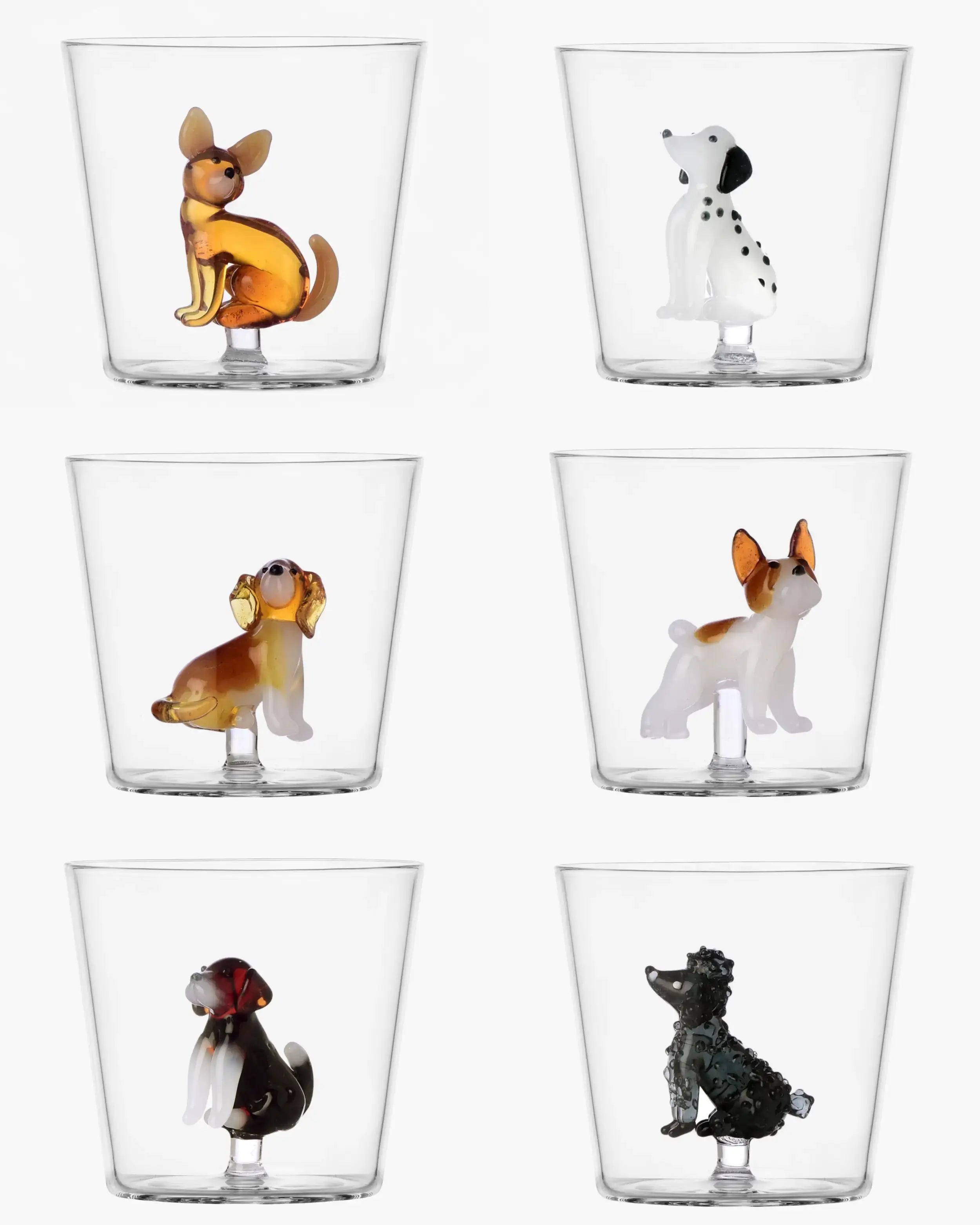 Ichendorf Dogs 6入水杯組由Alessandra Baldereschi設計,帶來對犬類魅力多樣性的趣味致敬。每個手工製作的硼矽玻璃水杯都描繪不同的犬種,將餐桌變成一個歡樂的舞台,寵物成為聚會的夥伴。從貴賓犬的優雅到鬥牛梗的活力,從尋回犬的忠誠到獵狐犬的警覺,每個圖案都以幽默和深情捕捉其品種的精神。這個系列成為玻璃中的個性遊行,每位賓客都能找到自己喜愛的四足朋友的映像。這套組合是真正的義大利手工玻璃器皿作品。