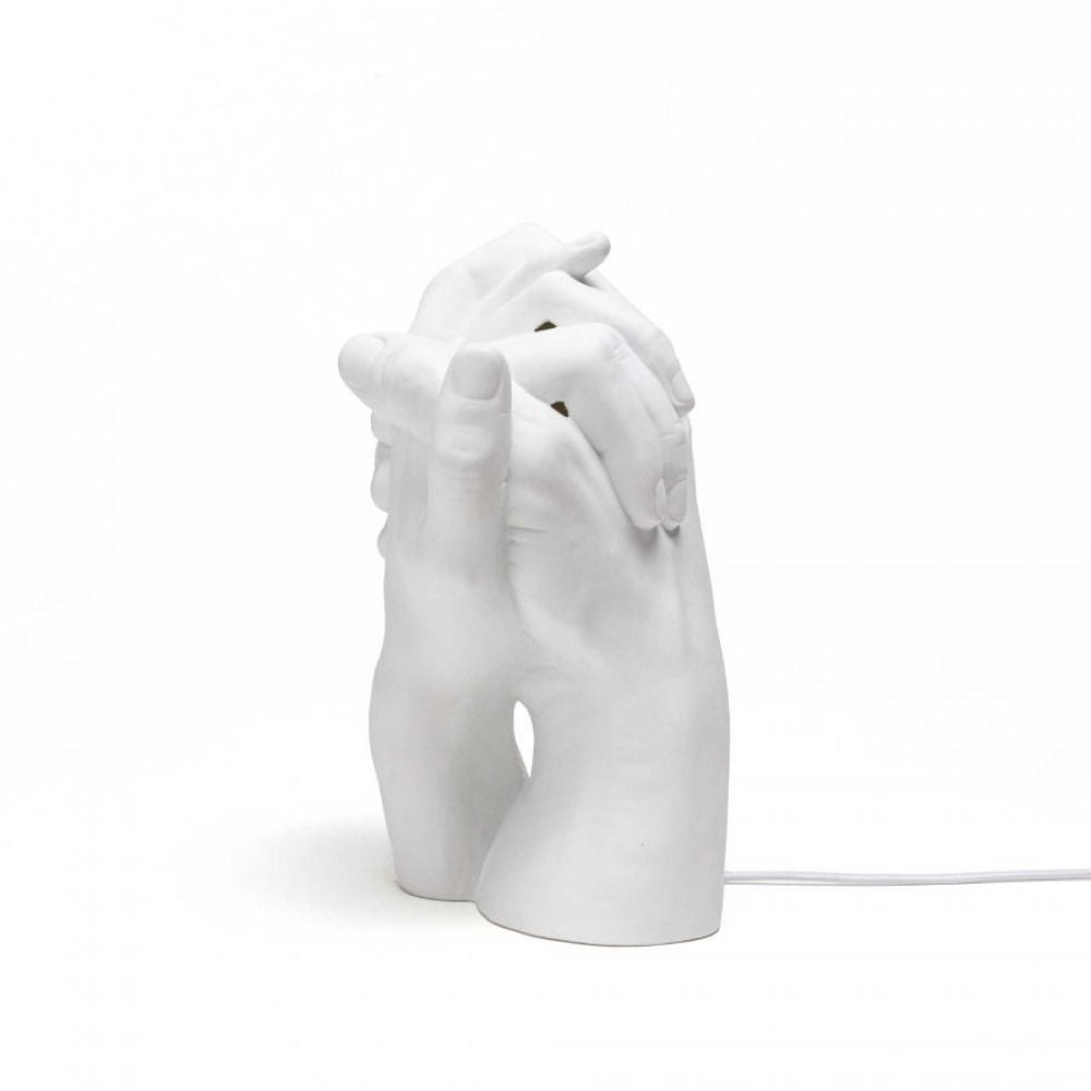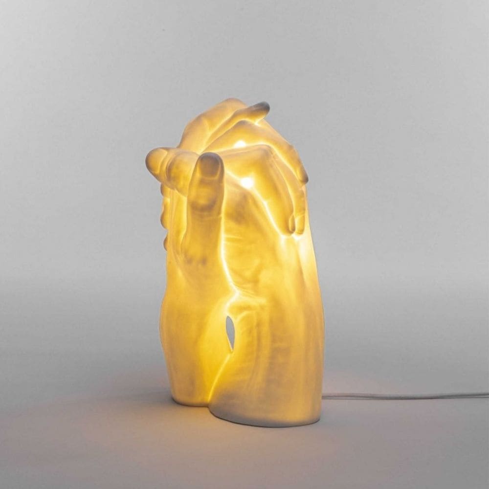 Created in smooth white porcelain, the lamp captures the softness of human touch through material precision. The LED bulb, already included, rests harmoniously between the hands, enhancing the piece with a soft, diffused radiance ideal for bedrooms, small reading corners, or personal spaces where atmosphere matters. Its indoor use and practical 2.5-meter cable make placement versatile, allowing the lamp to become a quiet anchor in modern interiors. As part of the Marcantonio Raimondi Malerba and Seletti collaboration, it reflects the designer’s ongoing dialogue between nature, gesture, and narrative. For those wondering how to choose gift lamps with emotional resonance, this piece offers a unique combination of symbolic design and everyday functionality.A Meaningful Object for Contemporary Interiors