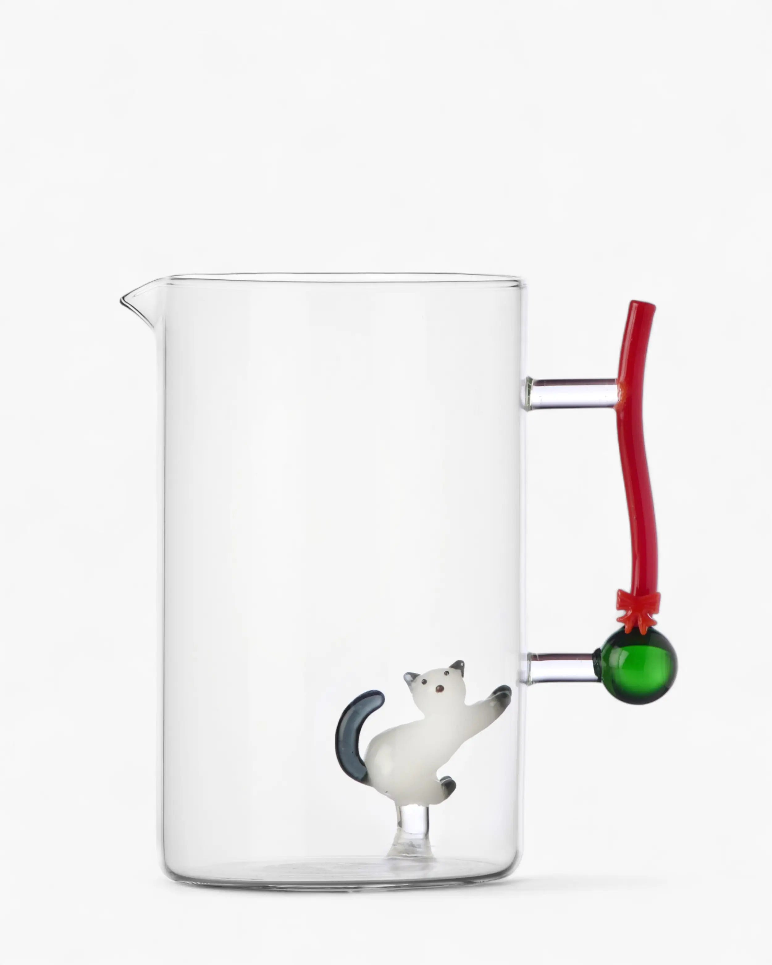 這個構想來自以將幻想融入日常生活聞名的設計師Alessandra Baldereschi。她的作品常模糊功能與寓言的界線,而這裡她輕鬆地達成了這一點。貓咪雕像是透過燈工技術塑形,這是一種古老的工藝,工匠用火焰和呼吸雕塑熔融玻璃。沒有兩隻貓是完全相同的:有的微微歪頭,有的更緊抱聖誕球,每一隻都展現出製作者獨特的手感。這水壺遠非大量生產的完美品,而是帶有手工藝的真實感,帶著小小的不完美溫度,使其獨一無二,就像所有的Ichendorf tumblers或其他產品如Ichendorf jugs和Ichendorf cups and mugs一樣。