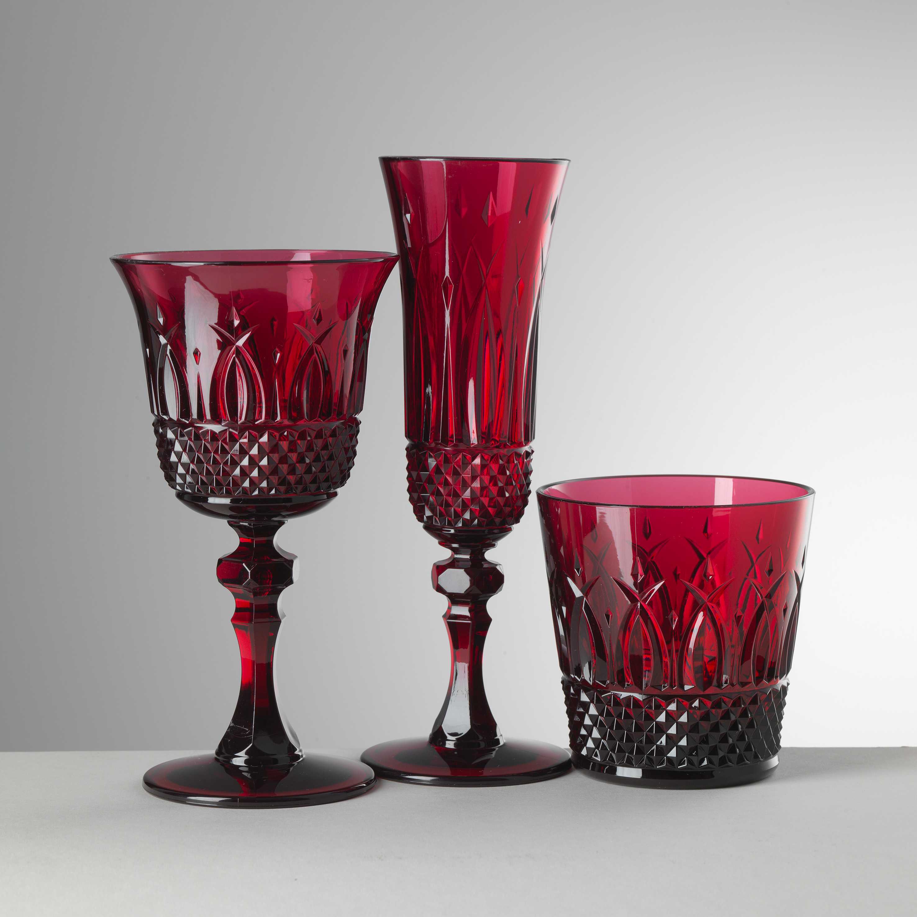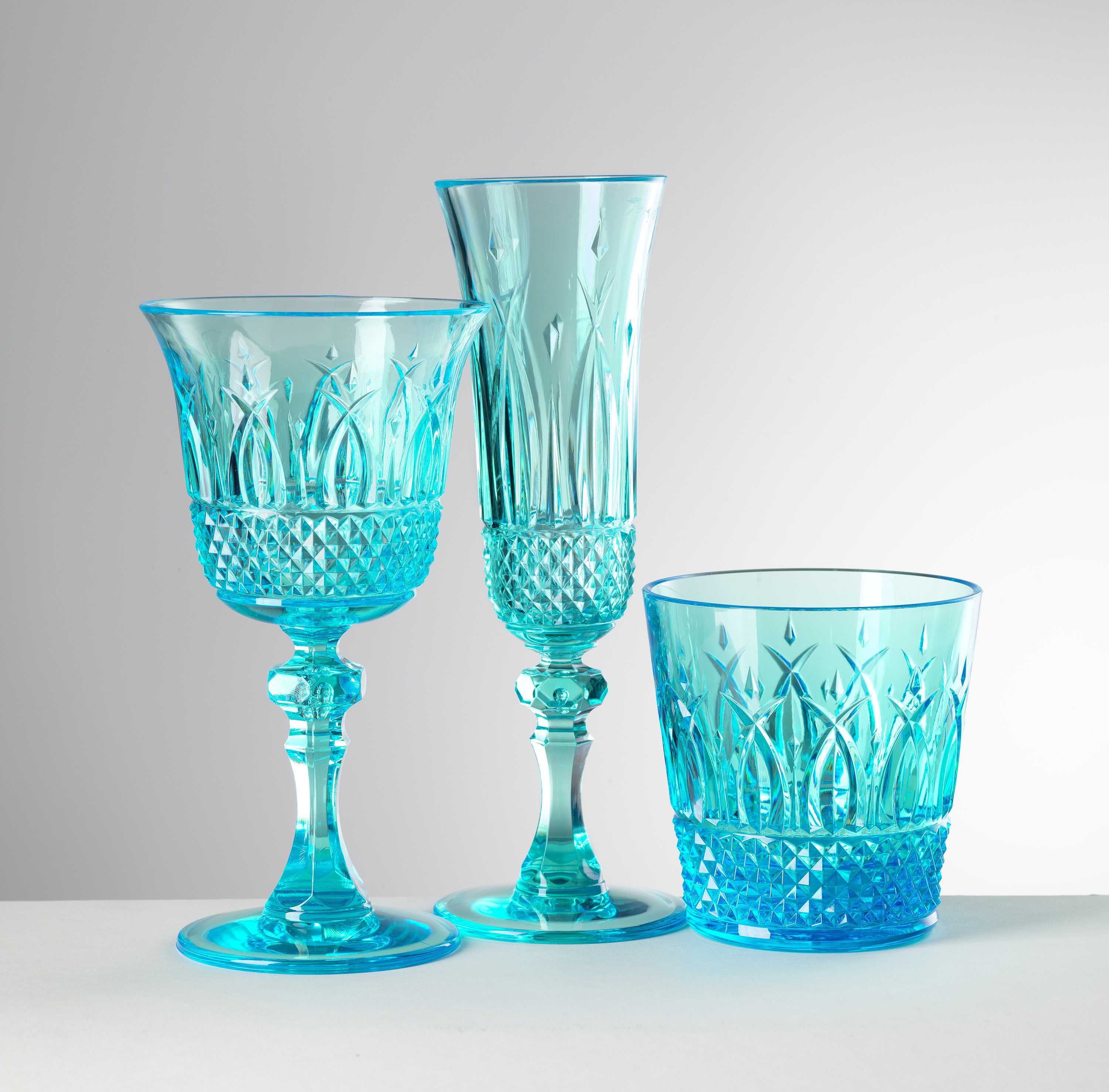 Italia flute is offered in a spectrum of luminous shades, such as blue, grey, ruby, turquoise, green, and clear. Each tone emphasizes its slender shape and faceted surface, producing dynamic light effects that highlight the color and effervescence of every drink. The flute integrates seamlessly with