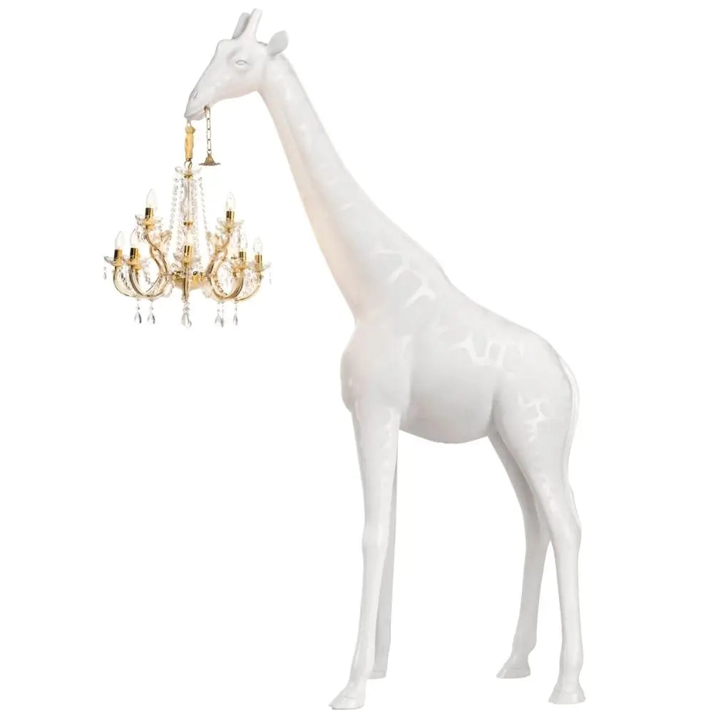 Qeeboo Giraffe In Love M落地燈,造型如長頸鹿不僅僅是一件照明物件——它是一場全尺寸的舞台布景。由Marcantonio Raimondi Malerba設計,屬於落地燈類別,這尊令人印象深刻的造型驕傲地伸長脖子,托起一盞精緻的吊燈,營造出浪漫而超現實的對比。提供白色的或黑色的版本,M款高達非凡的265公分,帶來建築般的存在感,將客廳、閣樓、飯店大廳及精心設計的室內空間轉化為敘事場域。這隻長頸鹿成為無聲的主角,提供光線的同時,講述一個既幽默又優雅的視覺故事。