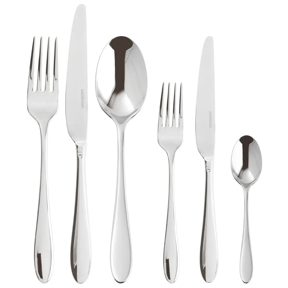 作為精選的Sambonet 餐具系列之一,Velvet餐具組提供六人份的協調餐具解決方案。24件組合包含六支餐叉、六支餐匙、六把餐刀及六支茶匙,配置均衡,適合日常用餐及優雅場合。採用不鏽鋼製成,且適用洗碗機清洗,兼具耐用性與精緻美感。作為一套奢華義大利現代餐具24件組,它兼具實用性與視覺和諧。