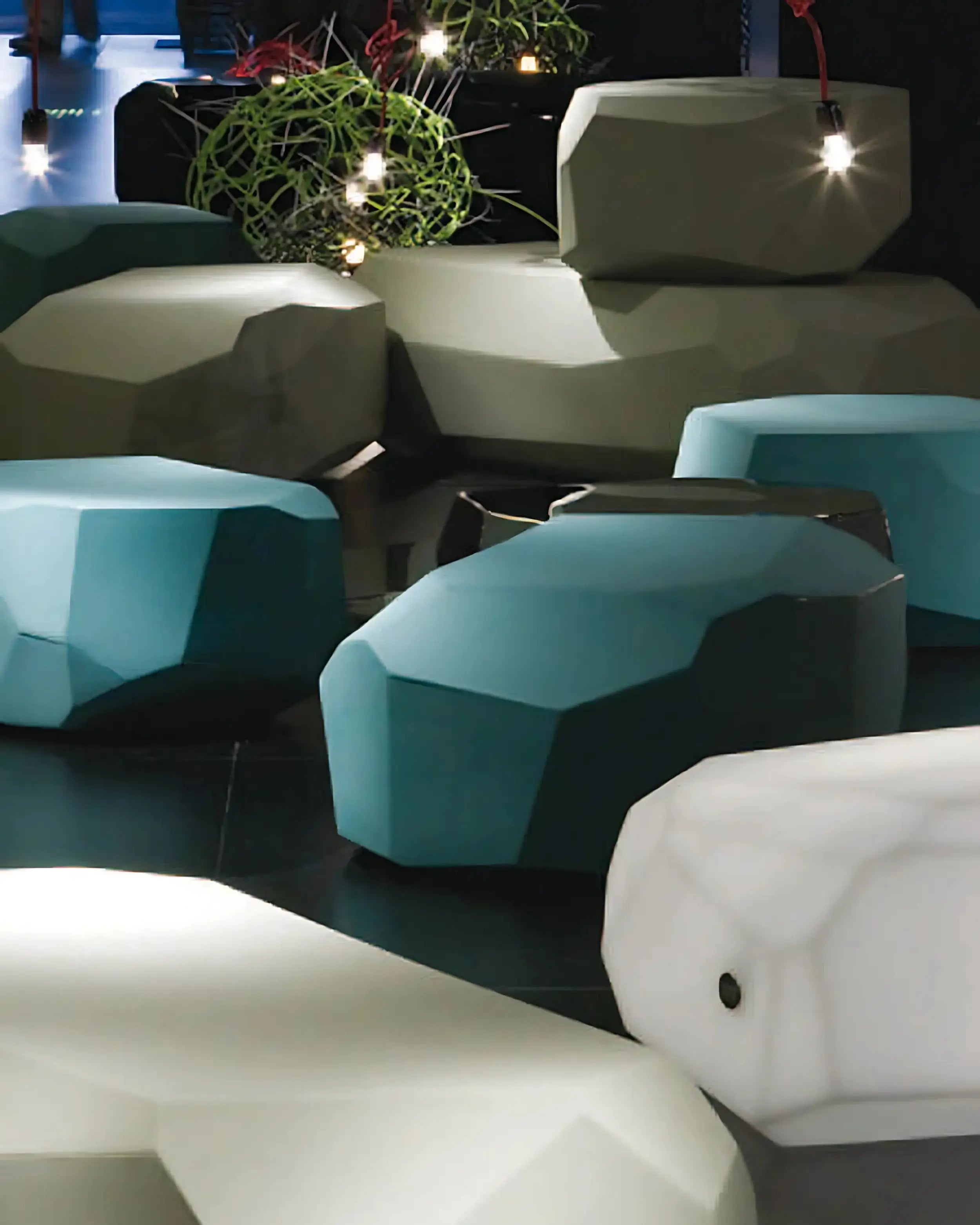 Meteor 系列有三種尺寸:小型、中型和大型,能滿足多種用途。較小的版本作為聚乙烯邊桌,適合放置飲料、書籍或燈飾點綴,而較大的型號則可作為非正式的花園長椅。在款待環境中,Meteor 群組與 Pedrali 坐墊與凳子 搭配得宜,創造出功能性與雕塑感兼具的組合。