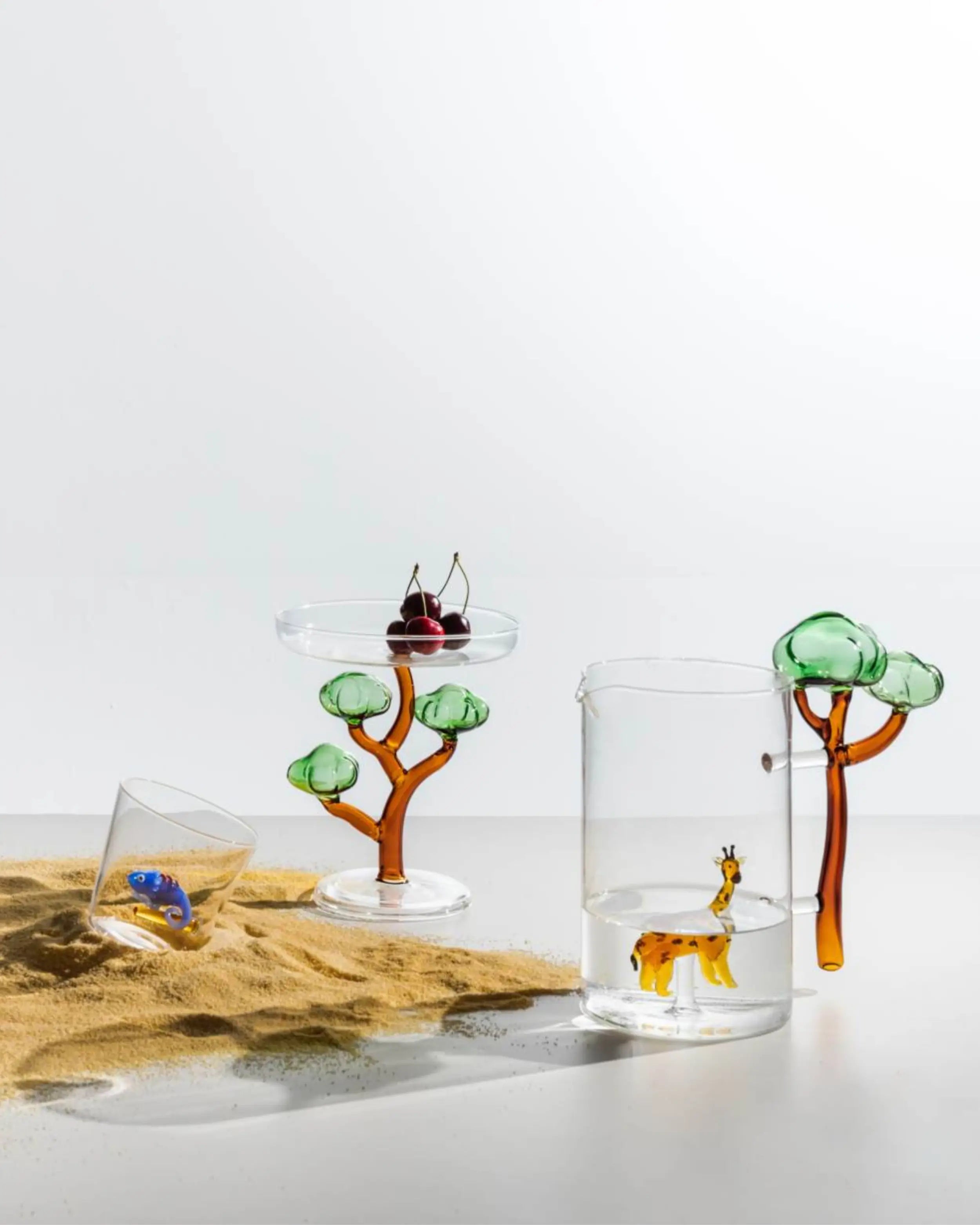Ichendorf Savannah Baobab Footed Plate,由Alessandra Baldereschi設計,以玻璃形式捕捉非洲猴麵包樹的雄偉。手工製作於硼矽玻璃,它立於雕塑般的底座上,兼具功能性與詩意的存在感。提供兩種尺寸,17 公分和 22 公分,能適應不同需求,同時保持相同的標誌性特徵。