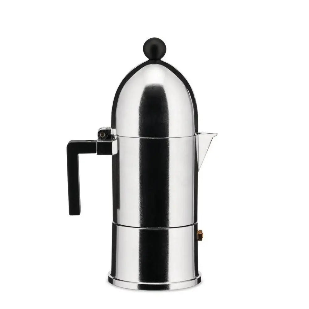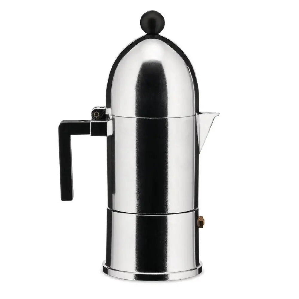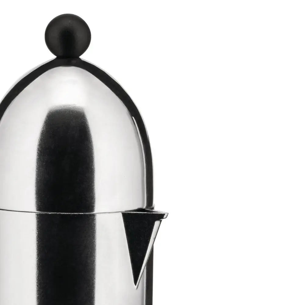 Alessi A9095 La Cupola 不鏽鋼咖啡壺,配黑色手柄和旋鈕 以建築般的精準與日常優雅重新詮釋您的濃縮咖啡儀式。容量為15毫升——適合3杯——專為食品用途打造,並設計為手洗以保持其光滑的表面。其獨特的圓頂形蓋子和啞光黑色點綴為您的晨間例行增添極簡風格,證明功能也能深具詩意。