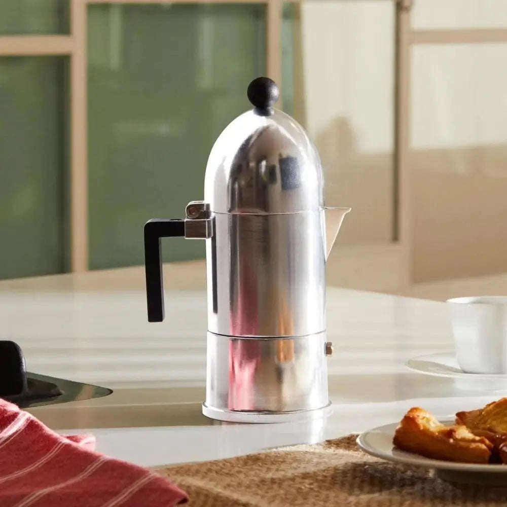 這款濃縮咖啡壺是著名建築師兼設計師Aldo Rossi的心血結晶,他對幾何與純粹形態的熱情無可置疑。作為著名的Alessi 茶與咖啡套裝系列的一部分,它於1988年被設計為一款「人人皆可用」的摩卡壺——簡單、親民且視覺上引人注目。其大膽的輪廓讓人聯想到古典圓頂,使其在Alessi 咖啡壺設計界中即刻辨識且永恆經典。