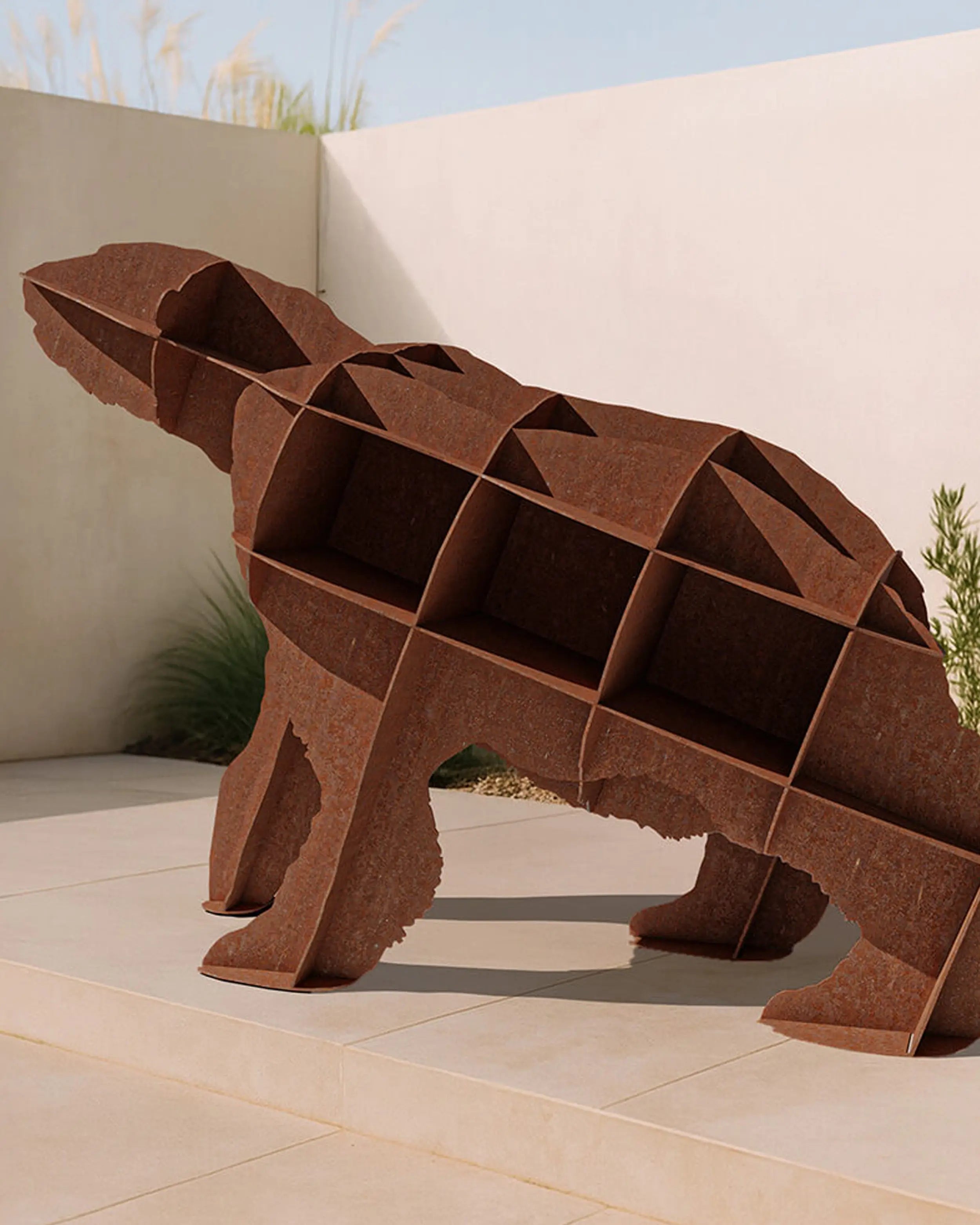 Created by Rachel & Benoît Convers, Joe reframes the bear as a guardian of memory: books, vessels, plants, and artefacts. Its strong profile brings scale and rhythm; its shelves act like lines of verse. Use it as a backdrop for a reading corner or to punctuate a long veranda. For clients asking how to decorate with corten steel, Joe demonstrates how warmth emerges from an industrial alloy when the silhouette is generous and familiar. In editorial or hospitality projects, it reads as both sculpture and service, a rare combination in modern animal furniture.Across residential and contract contexts, Joe also answers practical queries, availability within the Ibride Corten line, pairing with companion pieces, and the reassurance of an object built to last. For shoppers comparing offers, it has earned its reputation as a benchmark designer bookshelf Ibride; those searching for the best price Ibride Joe bookcase will ultimately value its longevity and the narrative capital it brings to place. Joe is not just storage; it is a steadfast presence that quietly elevates the everyday.
