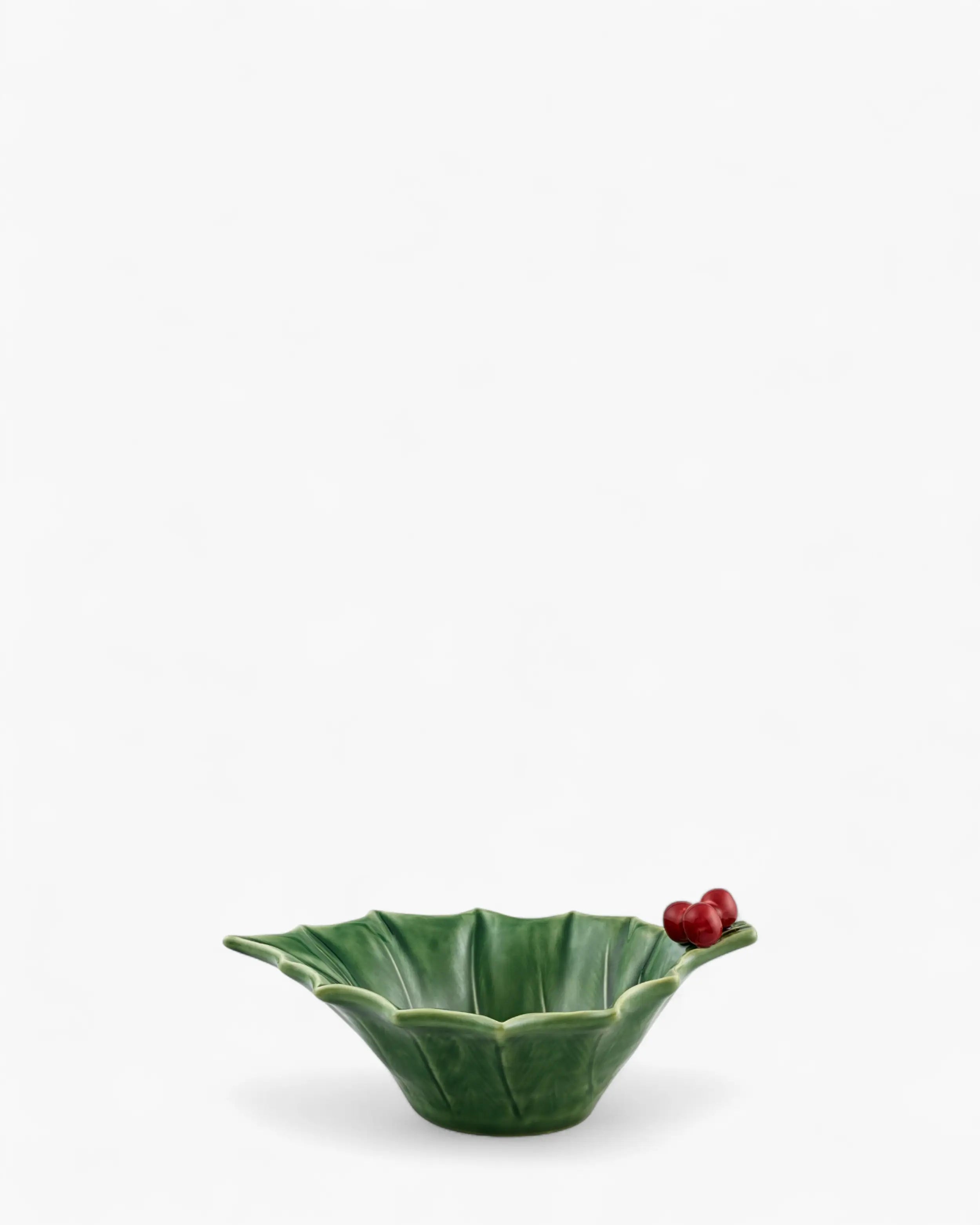 Playful naturalism has long defined Bordallo Pinheiro, and the imagination of Raphael Bordallo Pinheiro gives this object its exuberant character. Hand-painted details bring depth to the holly, while the silhouette stays balanced for frequent use. Style it with coordinating plates and chargers to build a cohesive tablescape, or let it stand alone as a small accent, either way, its presence is unmistakable.