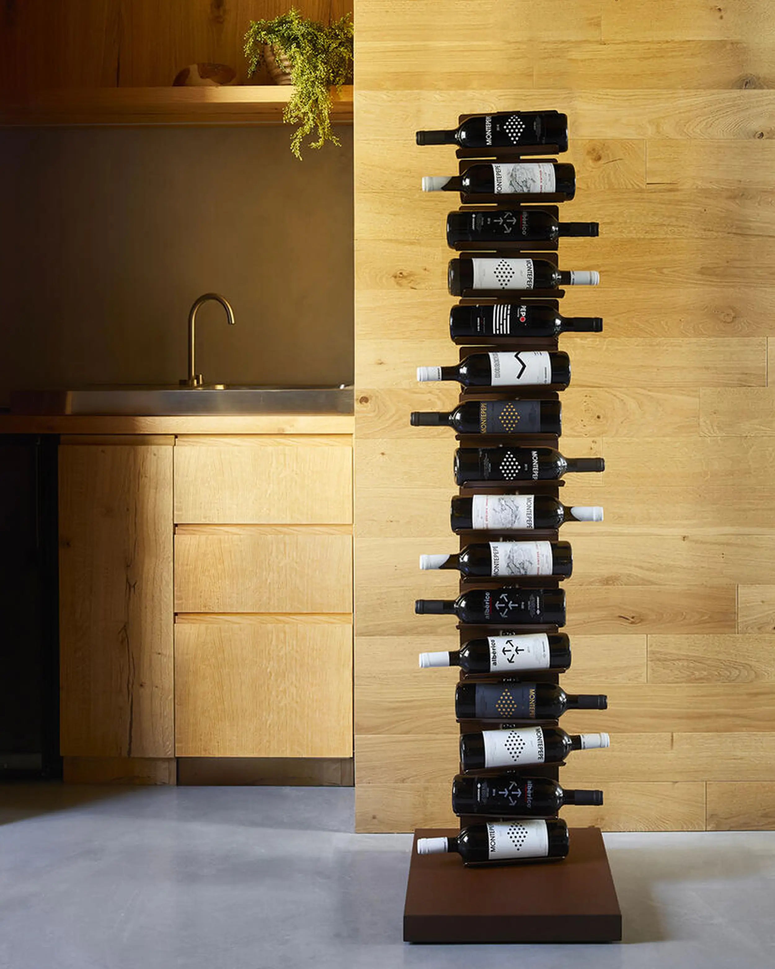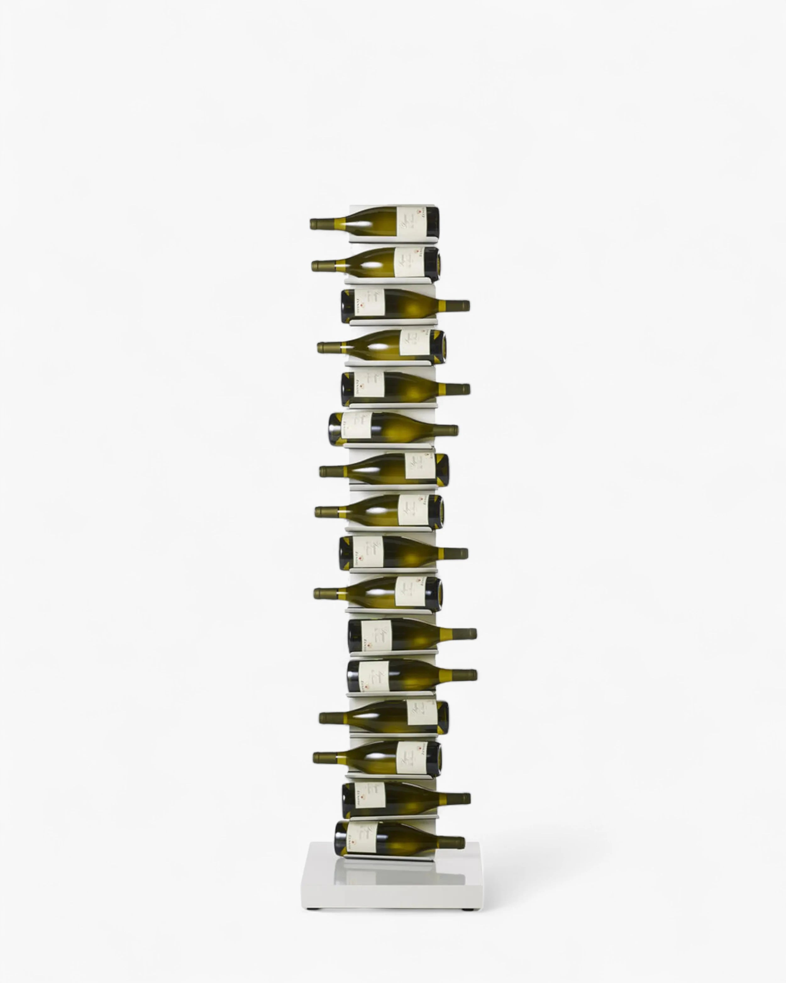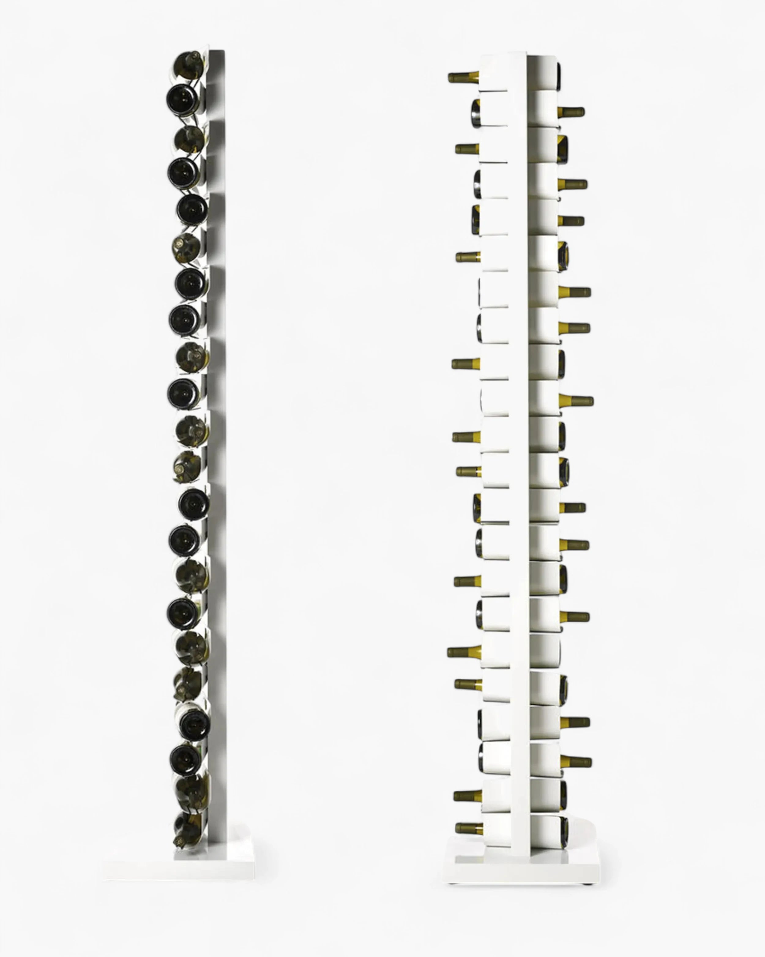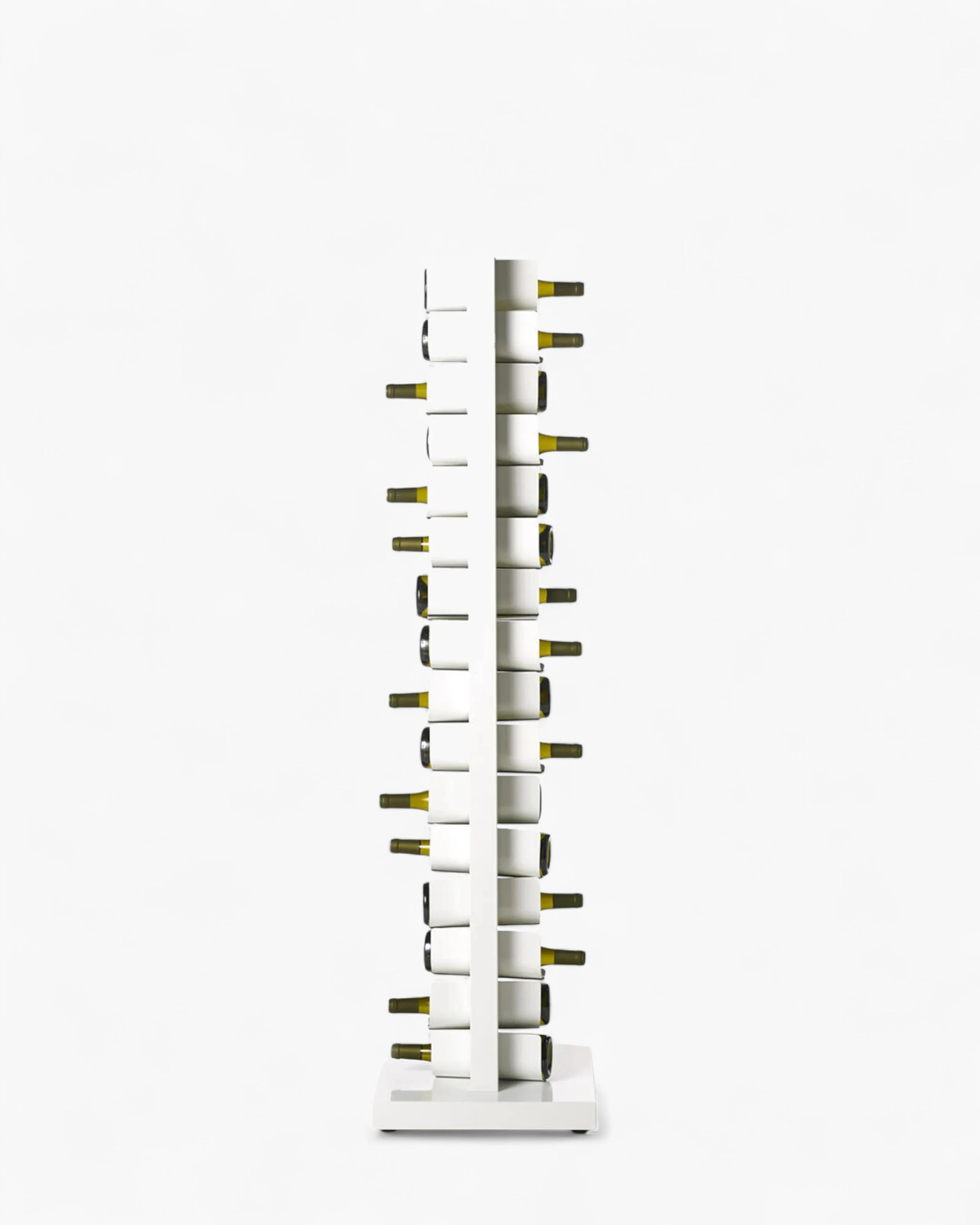 bottle rack, turning the act of storing bottles into a scenographic gesture. Minimalist yet bold, it blends seamlessly into sophisticated interiors, adding architectural balance and aesthetic impact.