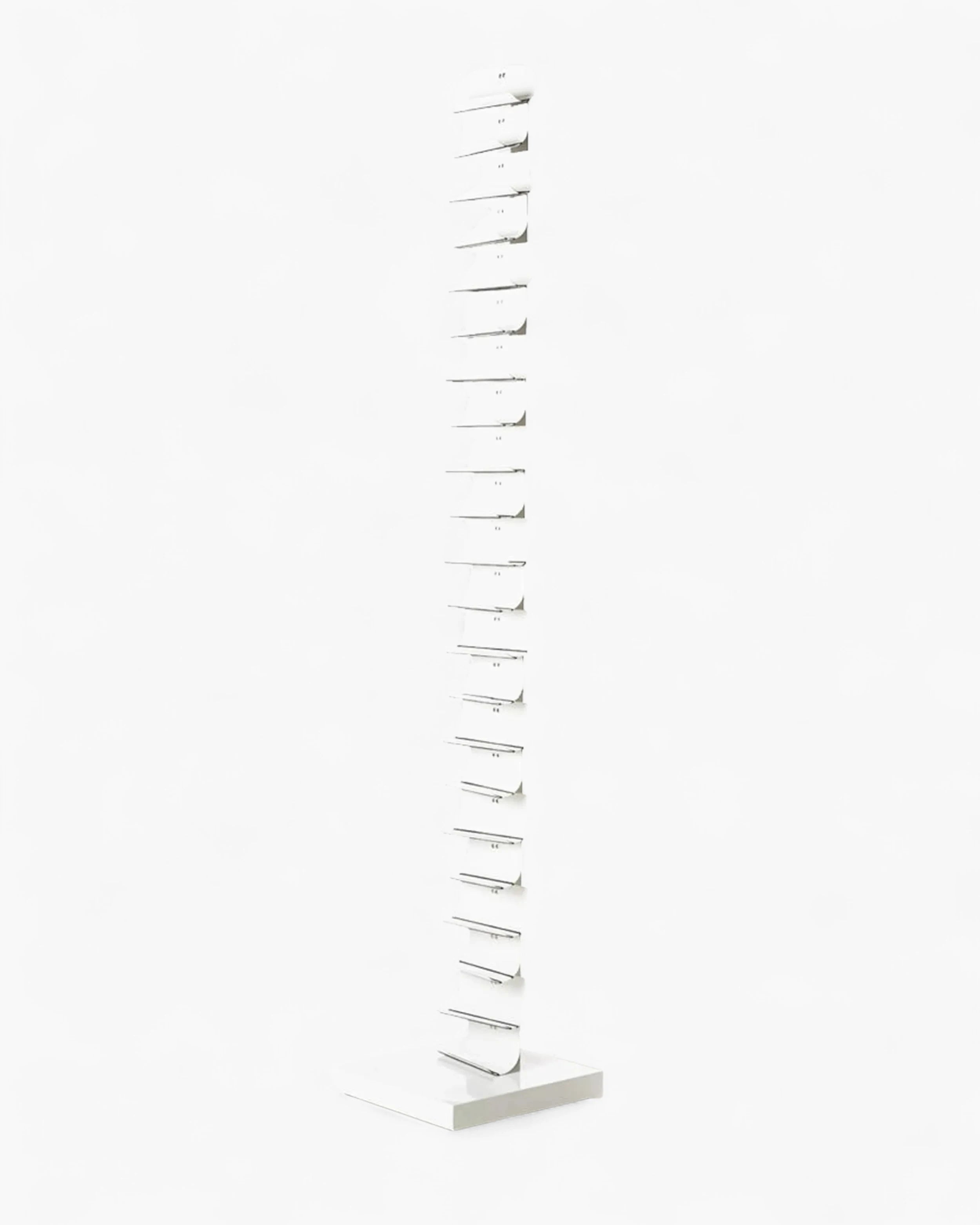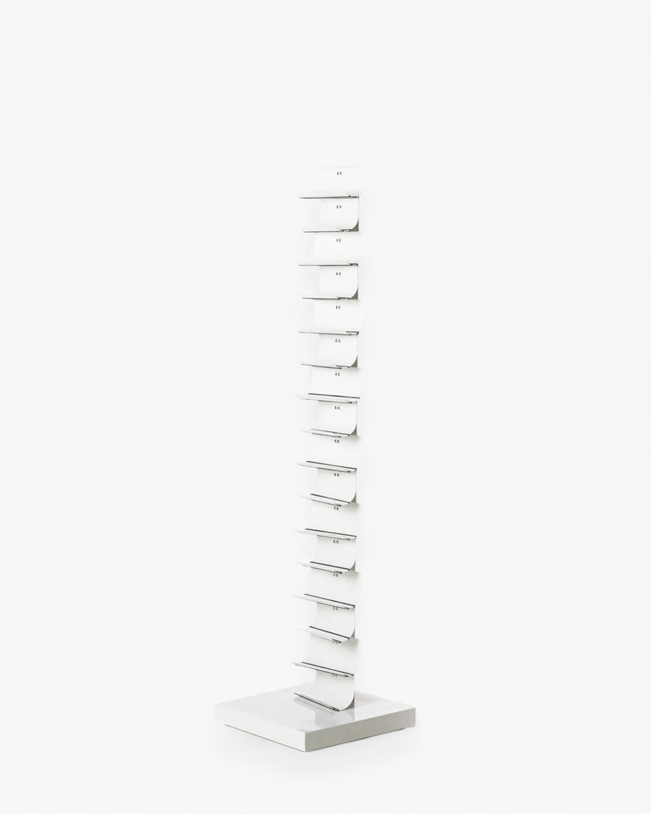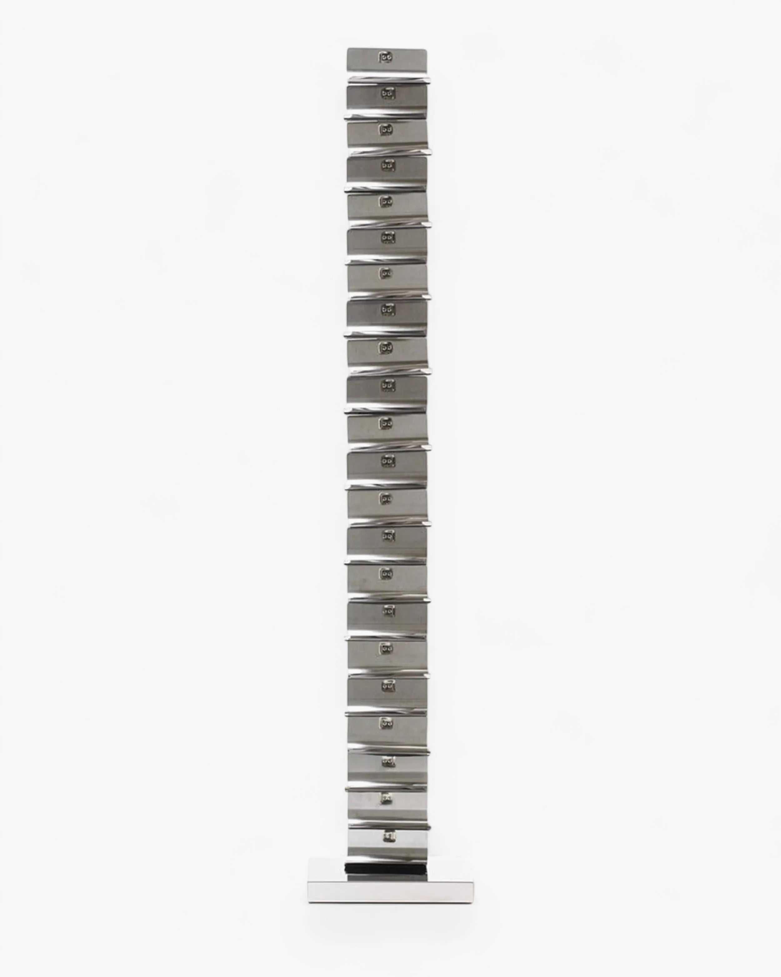 Crafted entirely in steel, this vertical free-standing structure is engineered with precision. It features adjustable feet for perfect balance, even on uneven floors, and shelves equipped with washable slip-proof elastic bands to ensure maximum stability. The engraved designer’s signature on the base enhances its collectible appeal, while its two available formats allow for storage of up to 8, 16 or 22 bottles. Its sculptural presence makes it an unmistakable example of how