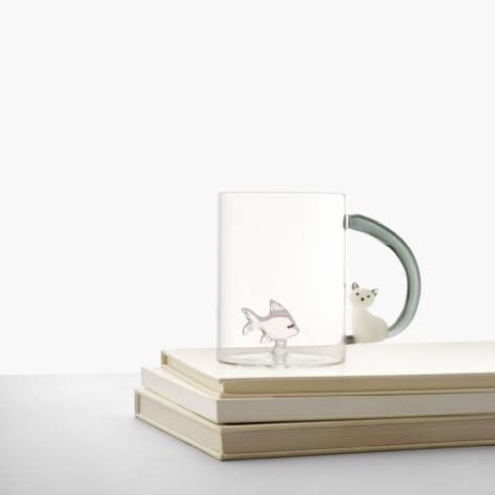 Made of handmade and lampworked borosilicate glass, this mug by Ichendorf showcases the material’s clarity and resilience while allowing delicate figurative elements to appear almost weightless inside. A small pink fish curves softly within the transparent volume, while a white cat with a smoke-coloured tail sits nearby, creating a scene that feels both serene and animated. The Tabby Cat Collection’s characteristics confirm that the piece is suitable for alimentary use and for dishwashing at low temperatures, though the finesse of its internal sculptures invites mindful care. Each component, from the cat’s gently modelled tail to the luminous colour of the fish, reveals the precision that defines Alessandra Baldereschi's work.