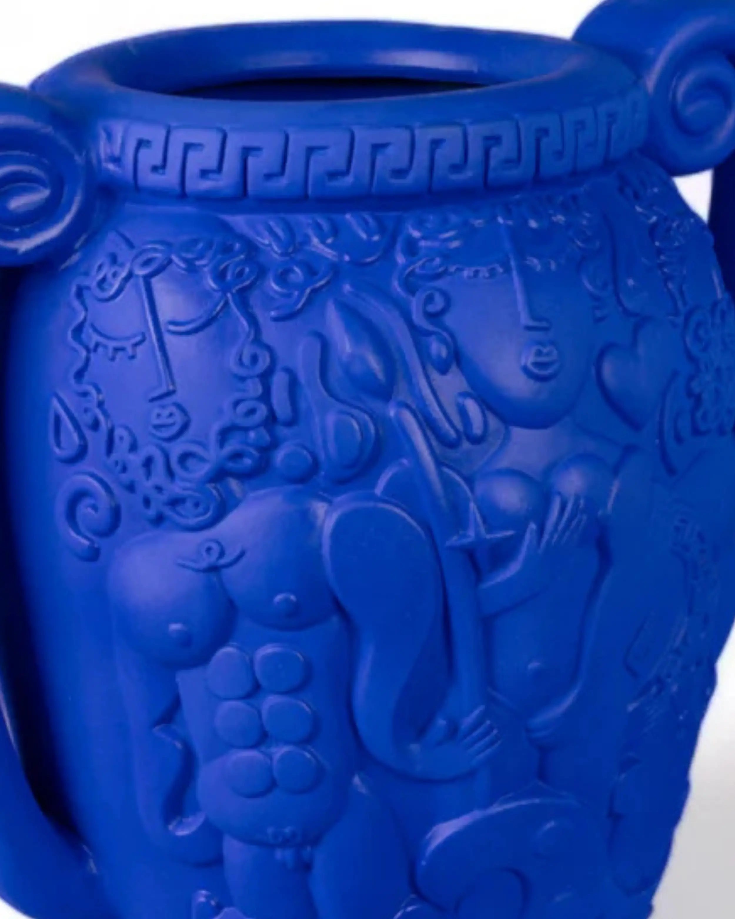 Hand finished in robust terracotta, the amphora carries the uneven skin and sunbaked tone of clay shaped by the hands of makers. The finish is deliberately honest: subtle striations, fine pores and a matt surface that responds to light. Terracotta ages gracefully outdoors and feels comfortable indoors. Choose warm terracotta or the cool blue variant; both harmonise with imaginative Seletti accessories and elegant table settings, making each piece a fragment of Mediterranean landscape.