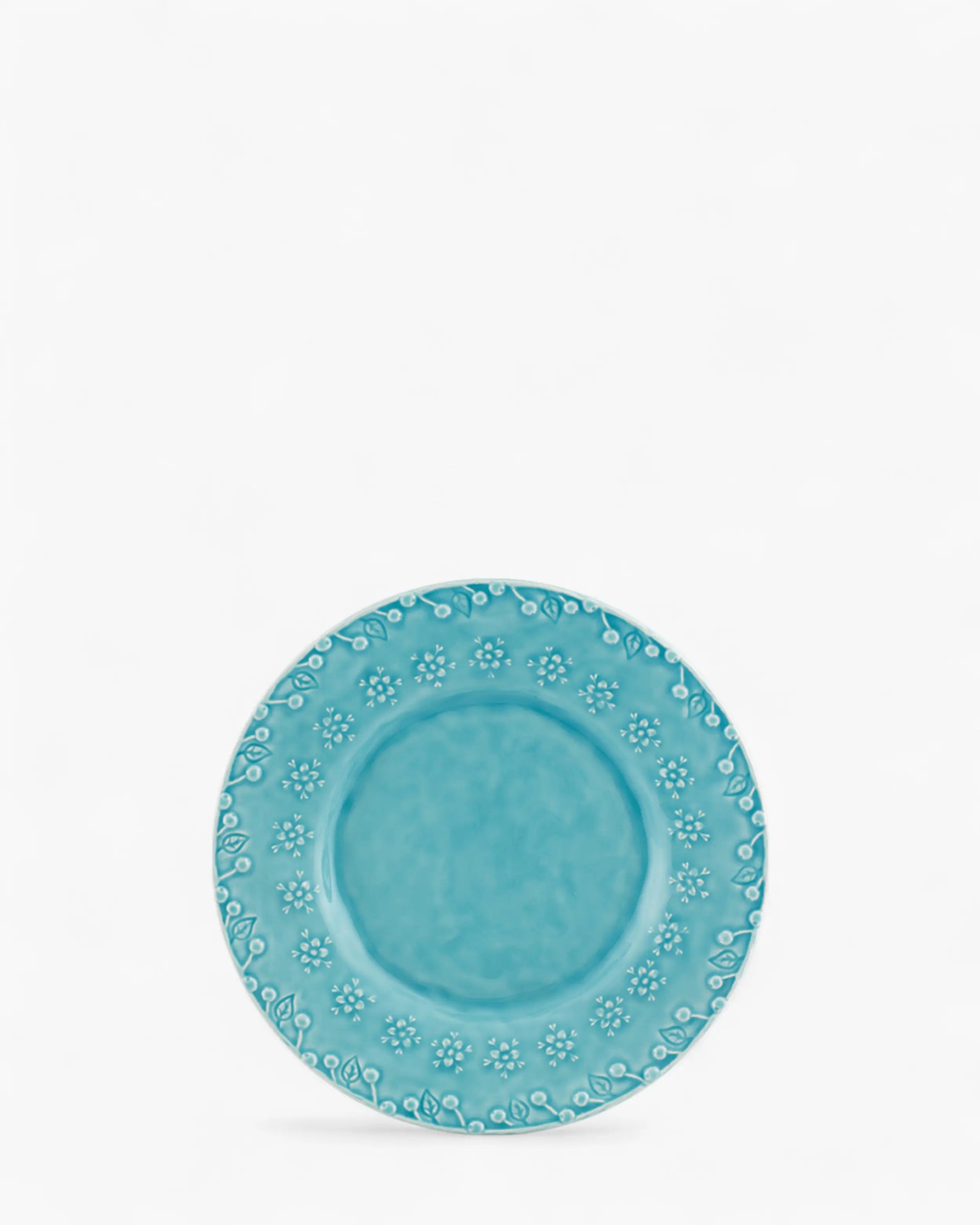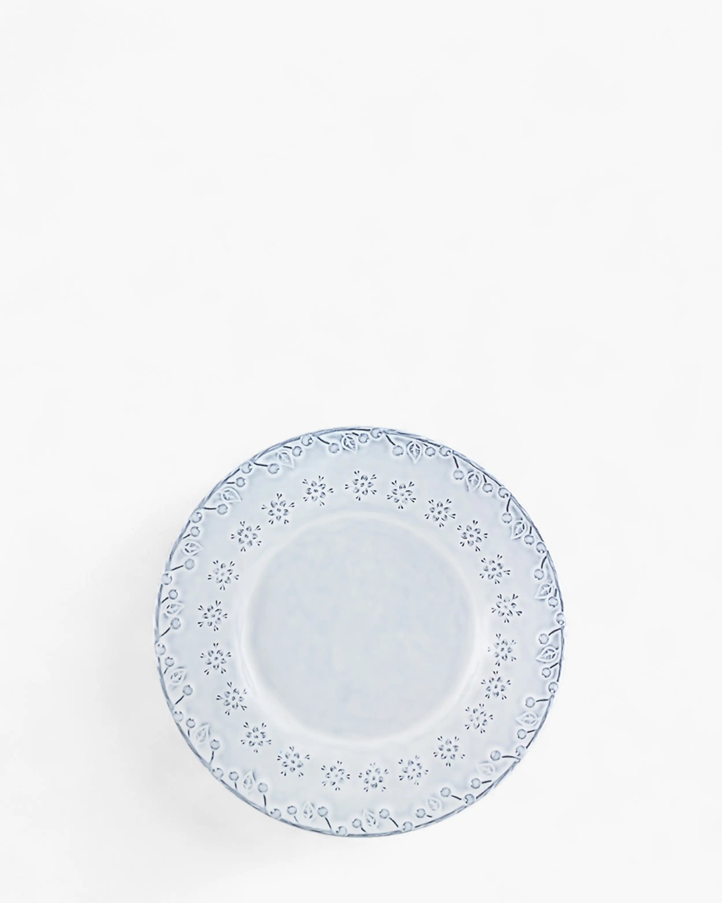 Handcrafted in terracotta and finished by skilled artisans, each plate showcases floral reliefs enhanced by a glossy glaze. Subtle variations attest to its handmade character, making every item unique. Available in two diameters: 23 cm (9 in.) and 29 cm (11.4 in.), it adapts to appetizers, main courses, or desserts with ease. The range also comes in four refined finishes: light blue, anthracite grey, light green, and white antique, offering versatility to match different moods and décors.