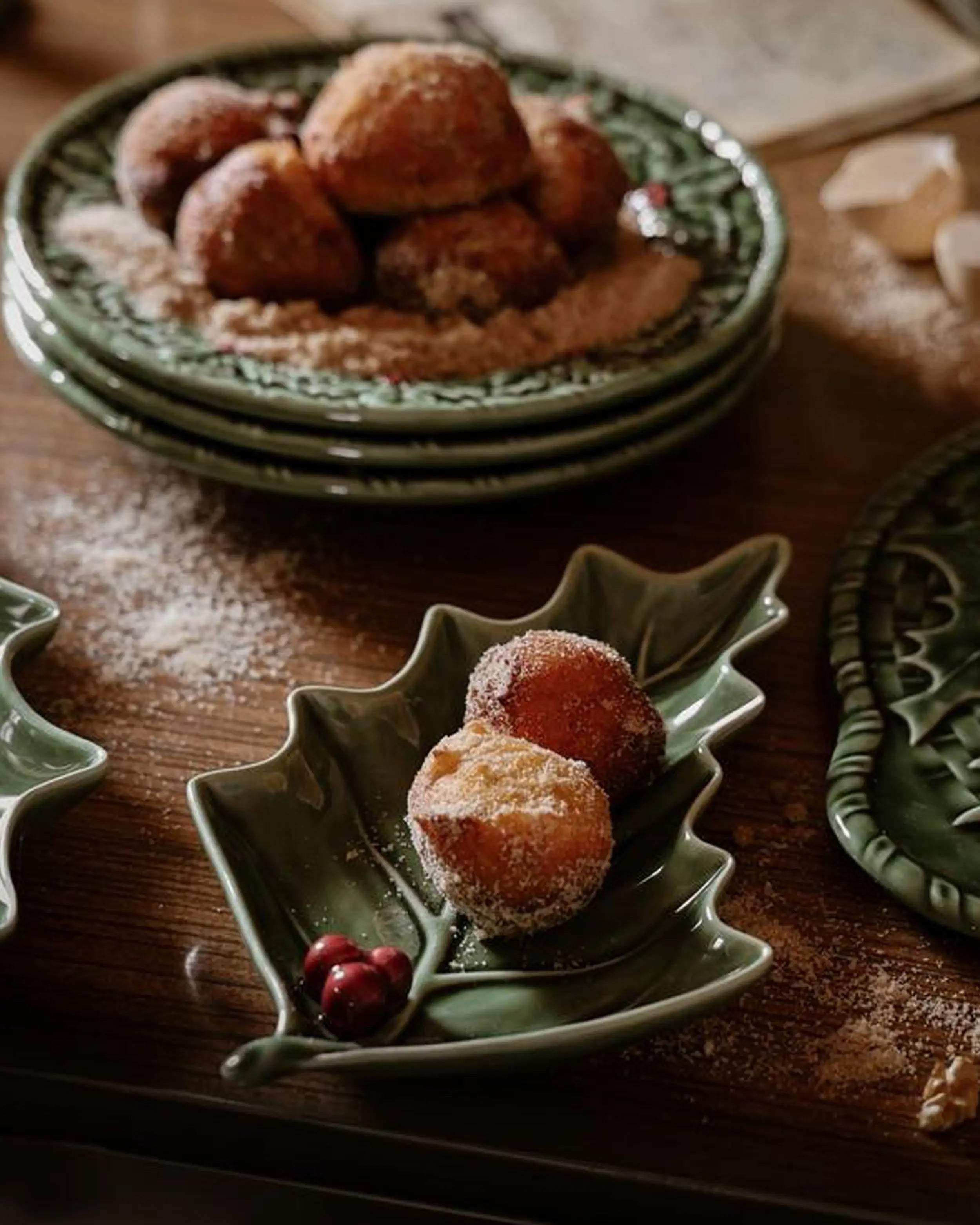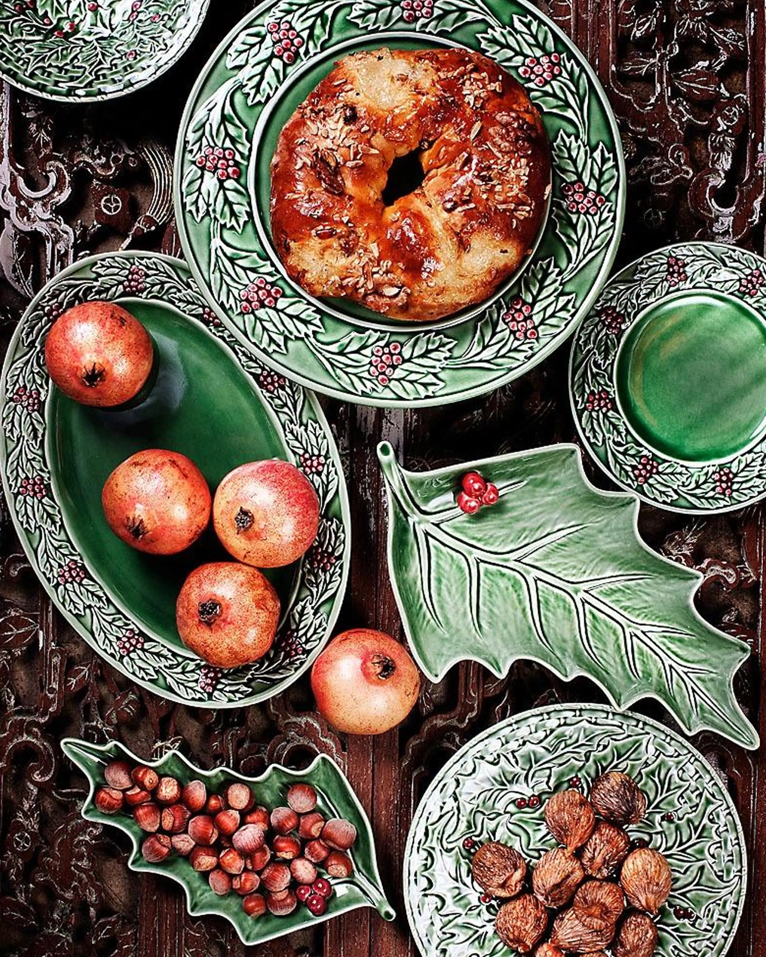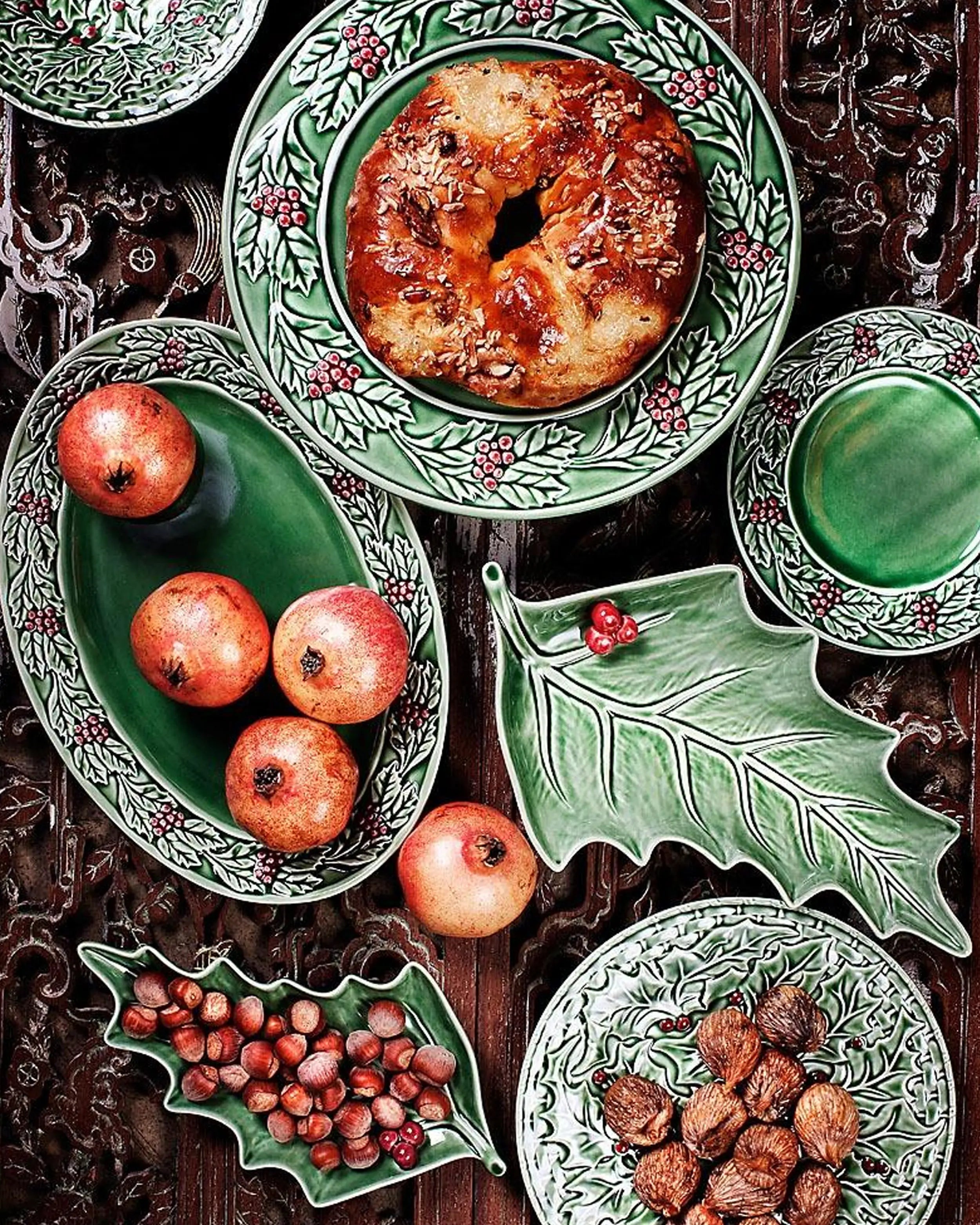 The Bordallo Pinheiro Holly/Azevinho leaf brings nature onto the festive table, turning a simple plate into a sculptural design object. Its hand-painted green leaves and bright red berries are modeled with lifelike relief, creating a piece that works both as a practical dish and as a decorative accent. Inspired by the resilience of holly, this design symbolizes renewal and celebration in ceramic form.