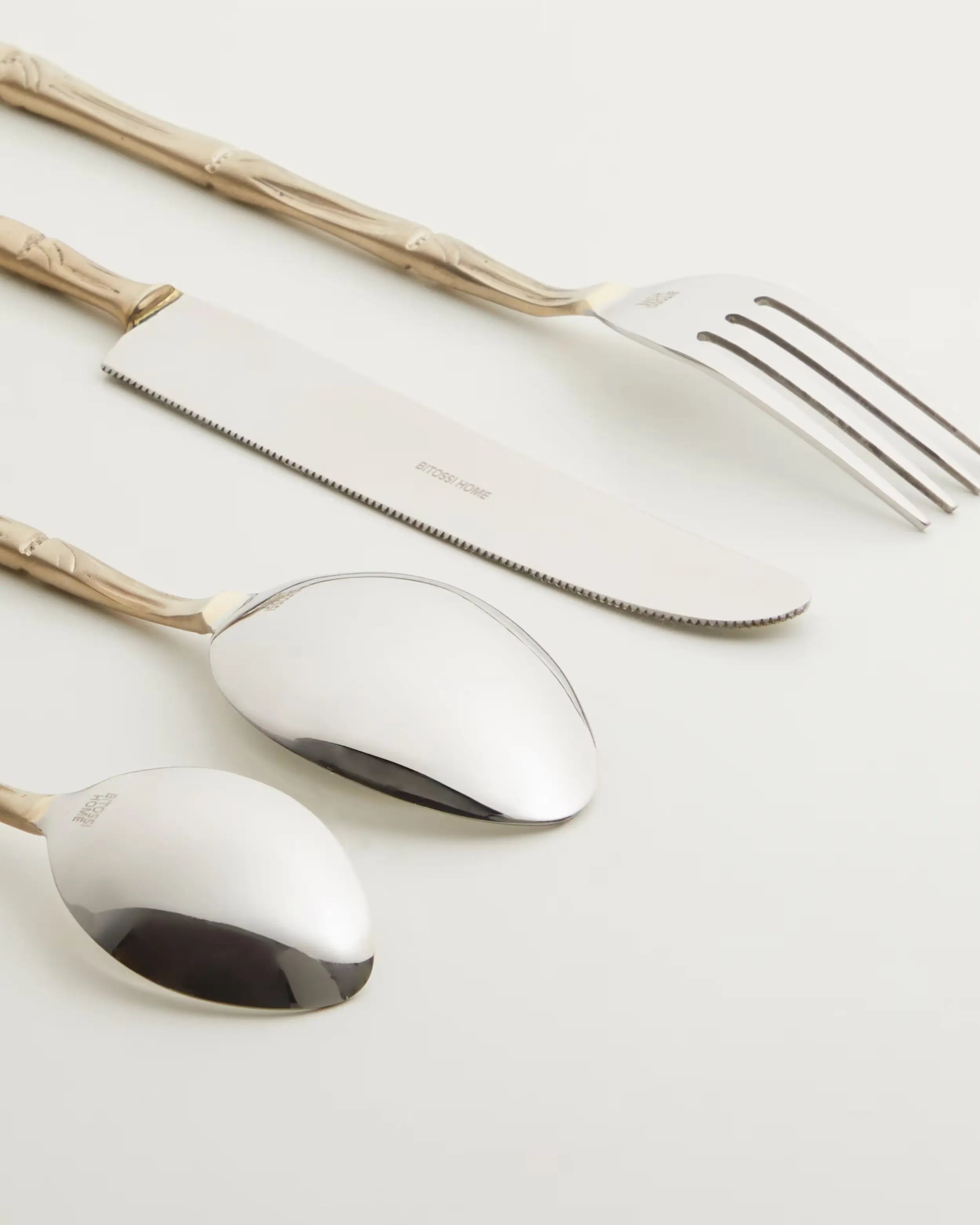 Refined yet full of character, the Bitossi Home Bamboo cutlery set of 24 pieces brings a touch of warmth and organic beauty to modern dining. Each handle evokes the elegant texture of bamboo, creating a perfect harmony between natural inspiration and contemporary design. The glossy stainless steel finish enhances its sophistication, making it suitable for both daily meals and the most curated table settings. This set embodies the essence of Bitossi cutlery: practical design elevated by distinctive Italian style.