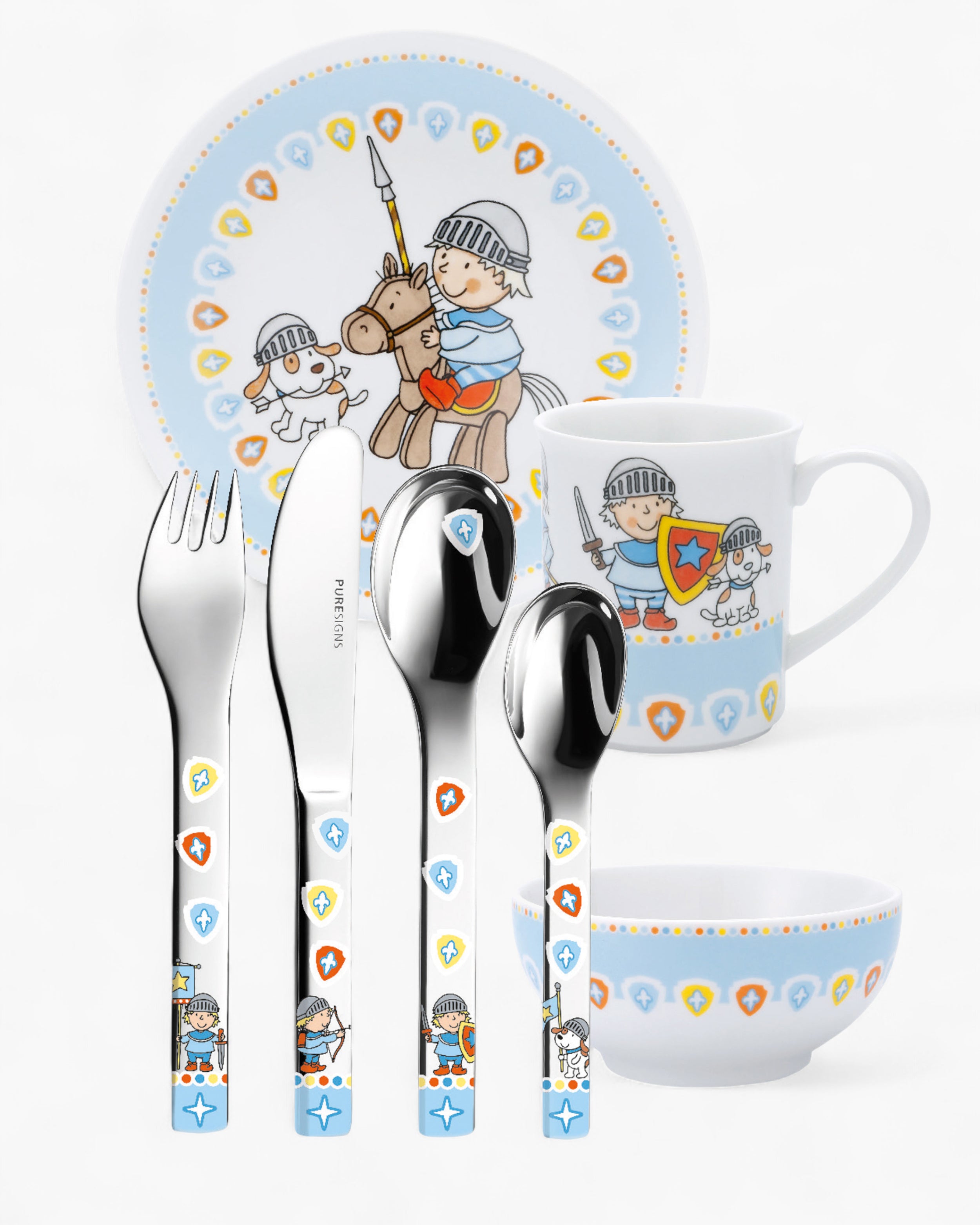 The service combines three porcelain pieces: plate, deep plate and mug, with four essentials in steel: bebè spoon, fork, knife and mini-spoon. Engravings on the cutlery echo knightly symbols, uniting the ensemble as a single story. This complete introduction to table rituals keeps young adventurers engaged while adults appreciate a considered aesthetic. In short, the knight theme kids dinner set pairs fantasy with reliability, the very essence of the Puresigns Miko dinner set.YOU MAY ALSO LIKE...