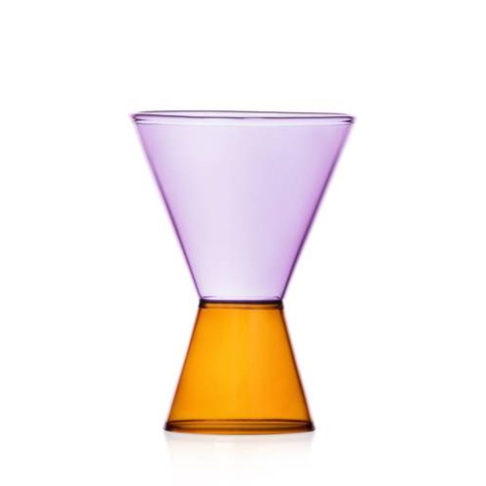 The Ichendorf Travasi triangle glass is a lively and sculptural interpretation of everyday drinkware, shaped by the inventive touch of Astrid Luglio. Part of the Ichendorf | Stemmed Glasses family, it stands out through its distinctive triangular form, a playful geometry that gives the object a dynamic, light-catching presence. Available in a purely transparent version or in refined combinations of amber and lilac, it brings colour, rhythm and character to contemporary tables. Its form harmonises naturally with the clear silhouettes of the Ichendorf Bottles Collection, creating settings where transparency and shape interact with ease.