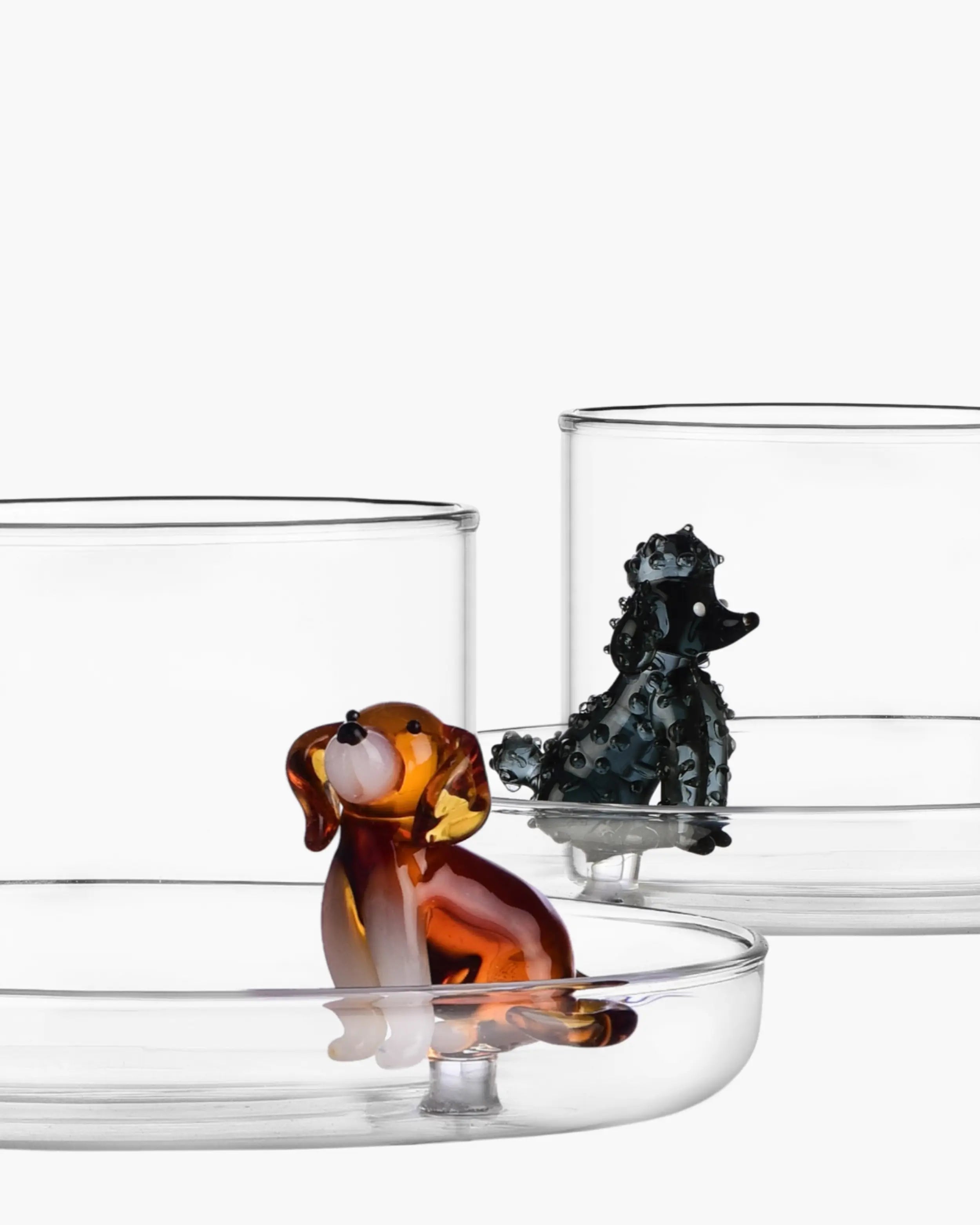 Each cup in the set is dedicated to a different breed: some elegant, some dynamic, some curious and playful, so that everyone can find their reflection in a four-legged personality. A poodle, a retriever, a terrier, and other iconic companions emerge within the glass with a touch of irony and tenderness. Baldereschi’s approach turns simple tableware into a collection of micro-sculptures, where the transparency of the glass frames the figurines like theatrical characters. These cups are ideal for cups collections at home.