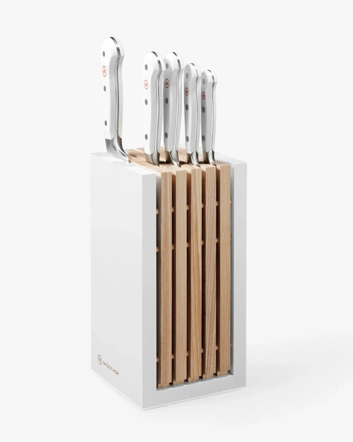 Our Knives & Co. collection features knives from the most respected names: Coltellerie Berti 1895 offers heritage and tradition in every hand-forged blade; Wüsthof, synonym for German craftsmanship, delivers durability and sharpness in its iconic set of Wüsthof knives; Kai, celebrated for its innovative Japanese design, blends beauty and functionality, as seen in the coveted Kai Shun Nagare Chef's Knife. Collaborations with designers like Gualtiero Marchesi, Zwilling, and Broggi Design bring cutting-edge creativity to each stylish and functional piece.