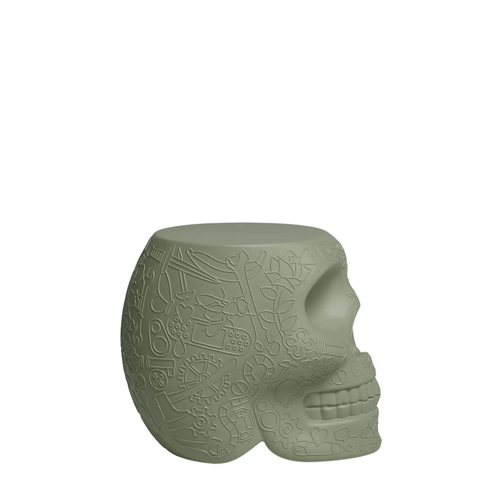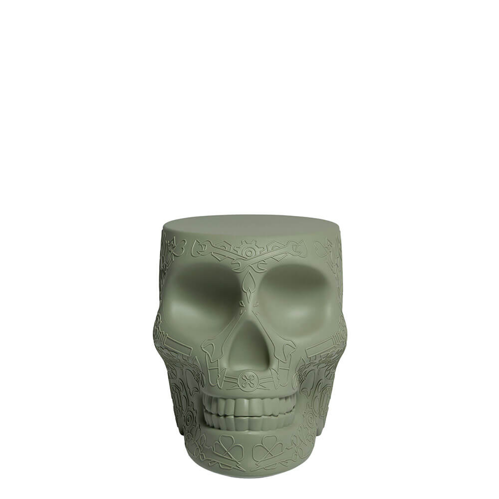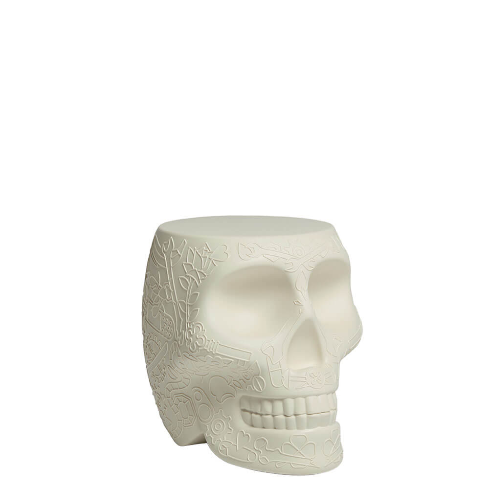 Made from high-quality polyethylene, the Mexico stool by Qeeboo ensures durability, resistance to weather conditions, and ease of maintenance. The material enhances the clarity of the skull’s graphic features, emphasizing its expressive contours and tactile appeal. As a polyethylene skull seat, it combines robustness with a smooth, refined finish, allowing the object to maintain its aesthetic integrity over time, even in outdoor environments.