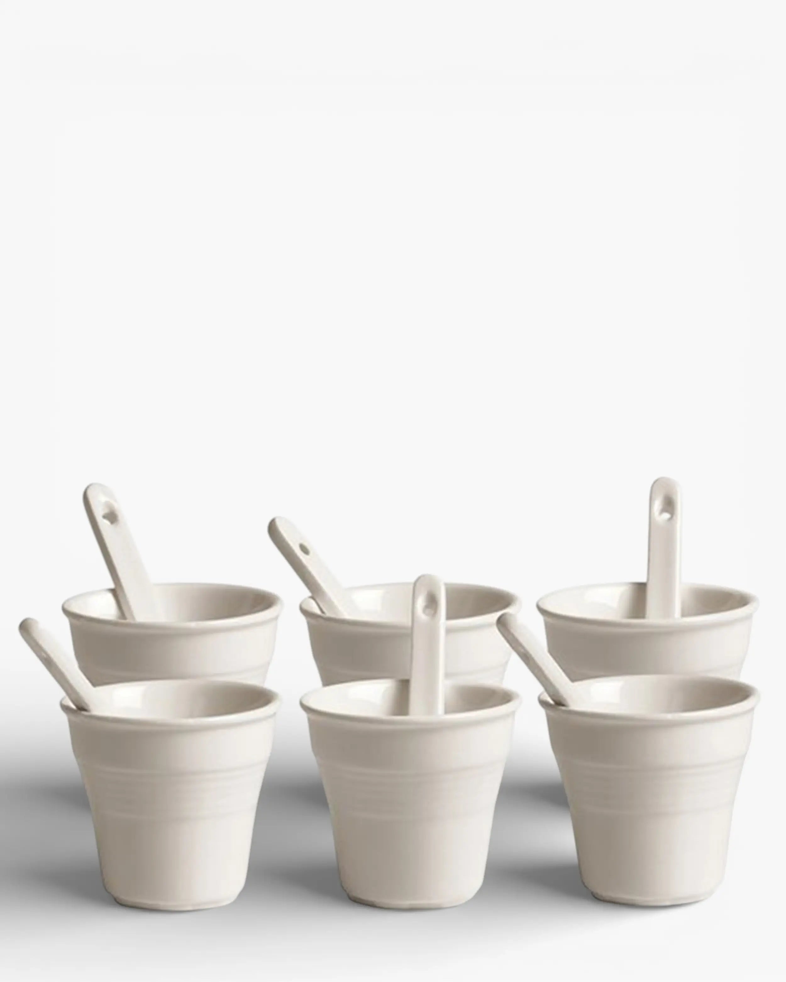 The set includes six espresso cups accompanied by matching stirrers, all crafted in fine porcelain. The shapes recall the light, functional silhouettes of disposable coffee cups, yet the material transforms them into collectible tableware. This distinctive contrast defines the identity of the Seletti Estetico Quotidiano espresso cups set, where temporary forms are reinterpreted as lasting design objects. Developed within the Alessandro Zambelli x Seletti tableware collaboration, the project highlights the designer’s ability to reinterpret everyday objects with wit and elegance. The result is a refined designer porcelain espresso cups set of 6 that brings a contemporary design perspective to the ritual of serving coffee.A Playful Icon for Contemporary Coffee Moments