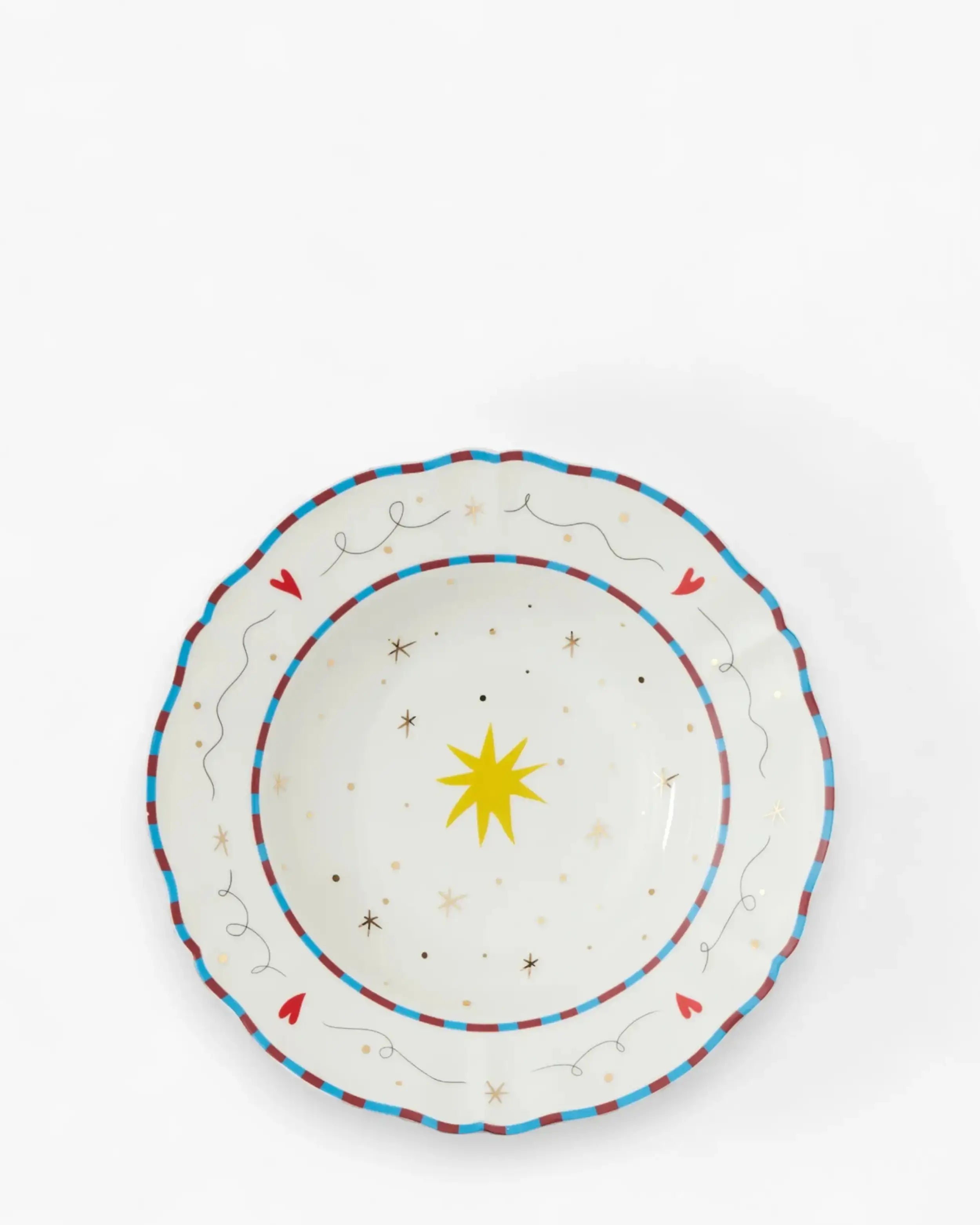 The design of “Mela” is more than ornamental: it’s an allegory of curiosity and elegance. Together with “Stella”, another emblem of this refined series, it invites us to rediscover the pleasure of symbolic beauty. Each porcelain fine porcelain pasta bowl style plate showcases the precision and sensitivity that define Italian tableware artistry. The decorative decals and patterned design enhance its sculptural surface, giving the collection a soft, tactile personality. These plates harmonize beautifully with the eclectic elegance of the Bitossi Con Amore collection and the experimental shapes of the Bitossi Diseguale collection, as well as the timeless sophistication of Bitossi tumblers & stem glasses.