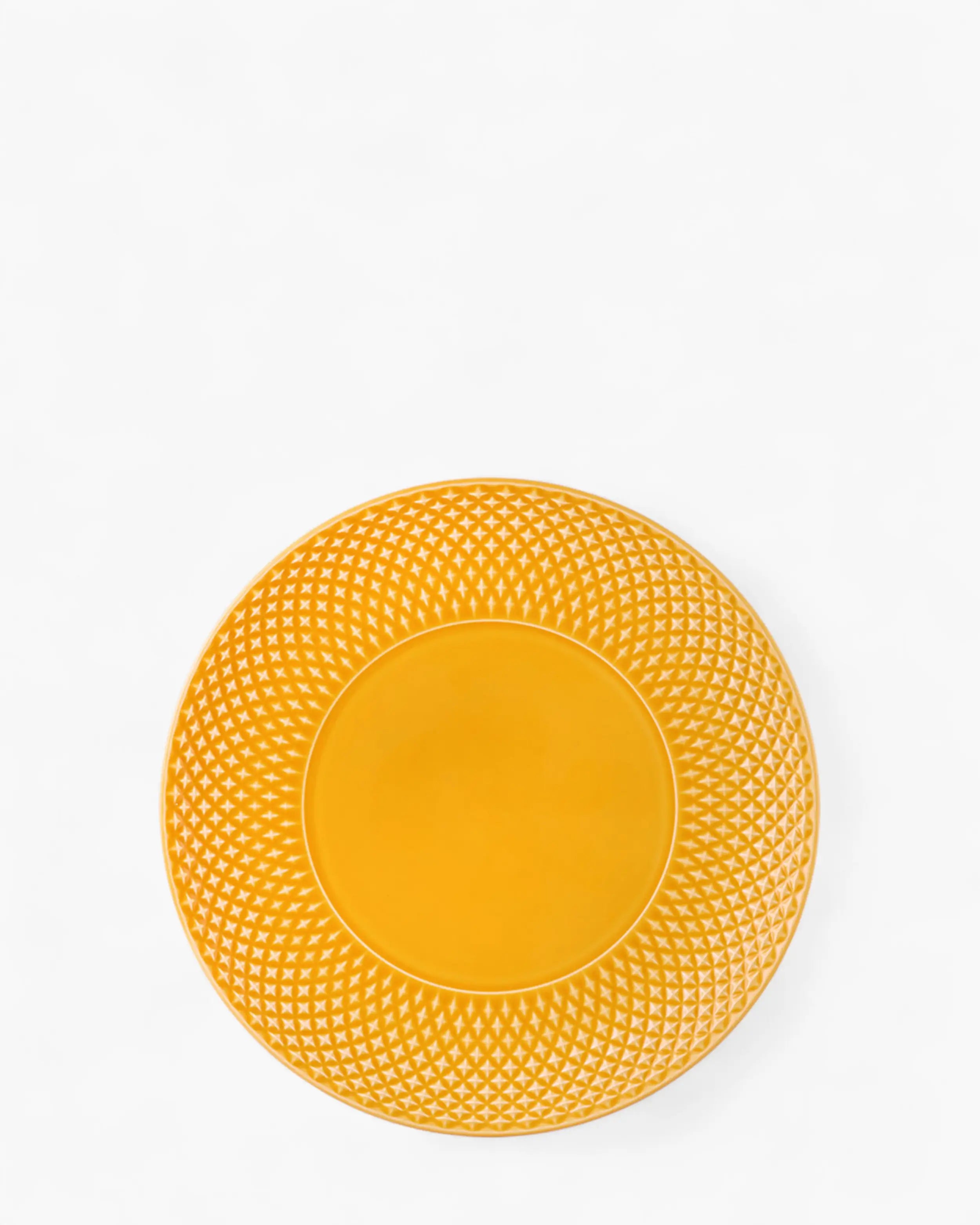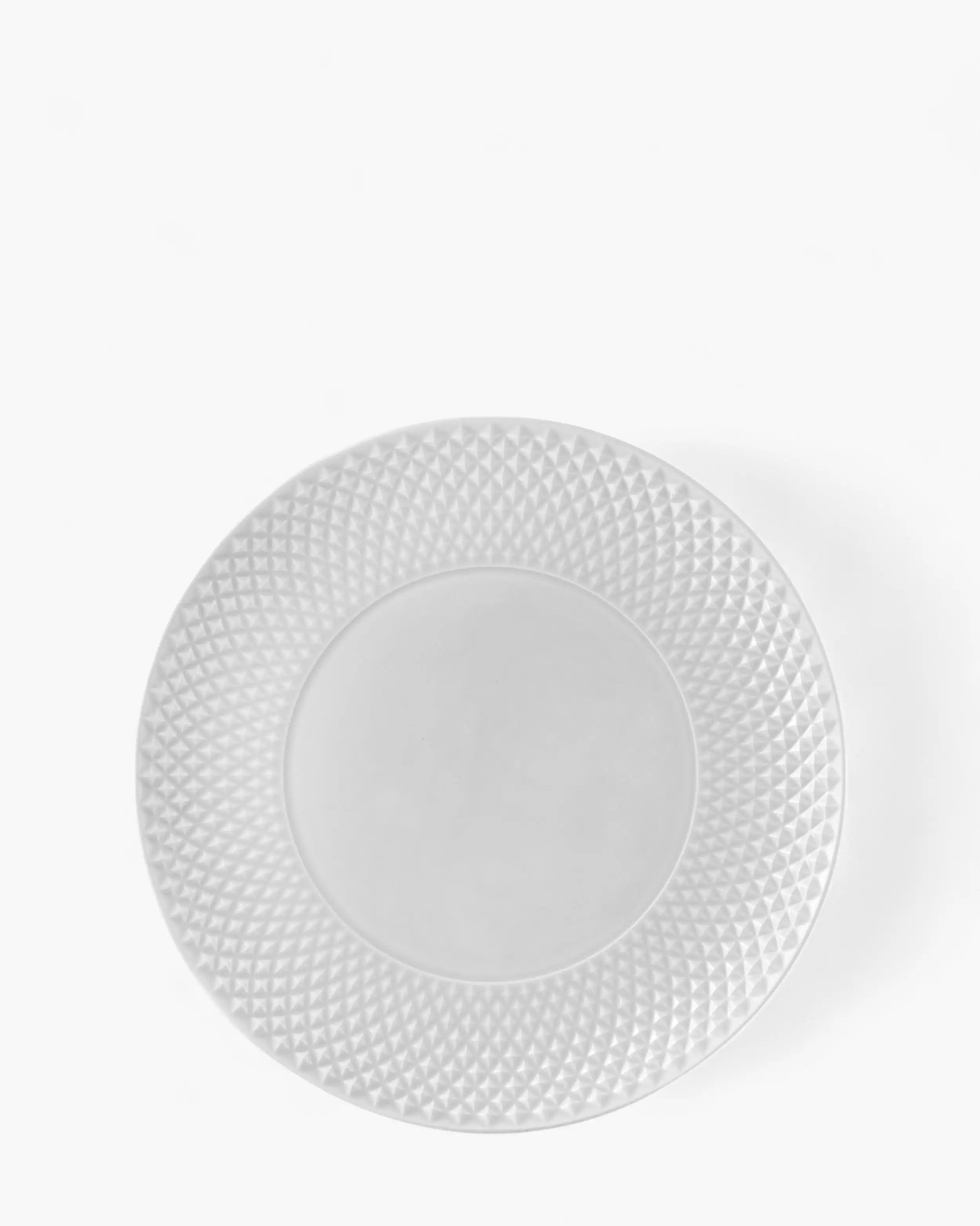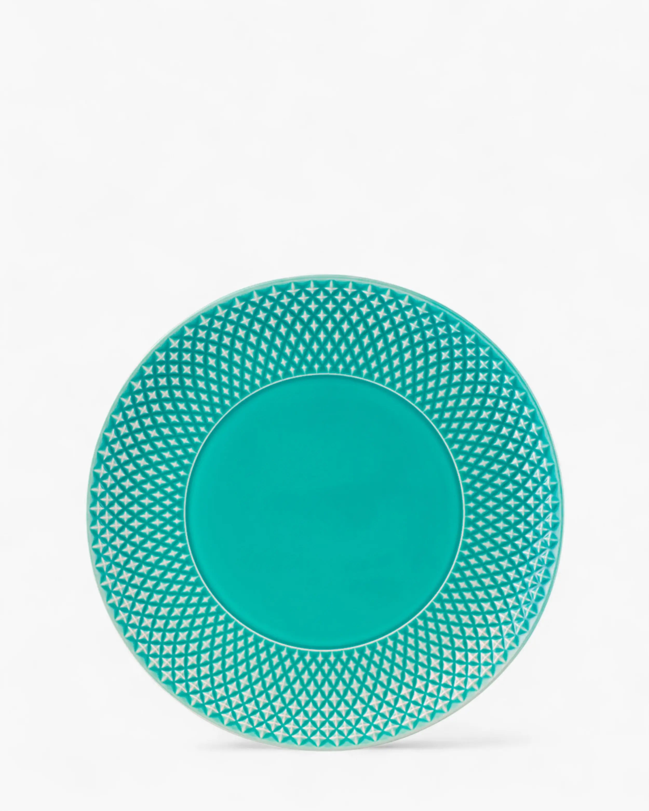 Bordallo Pinheiro Bicos plate is a conversation between shadow and light: a crisp grid of tiny diamonds that catches the eye without stealing the show. In this piece from