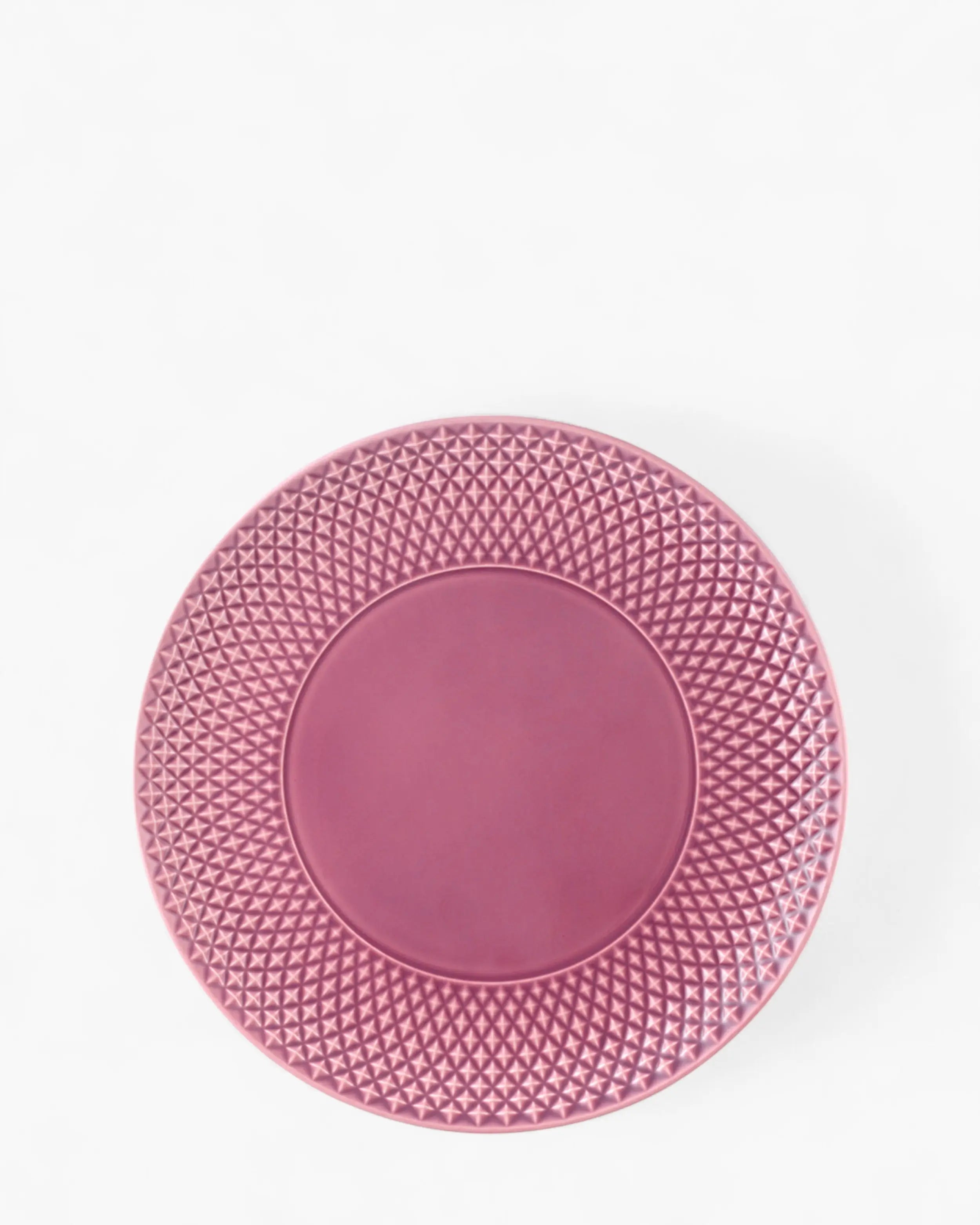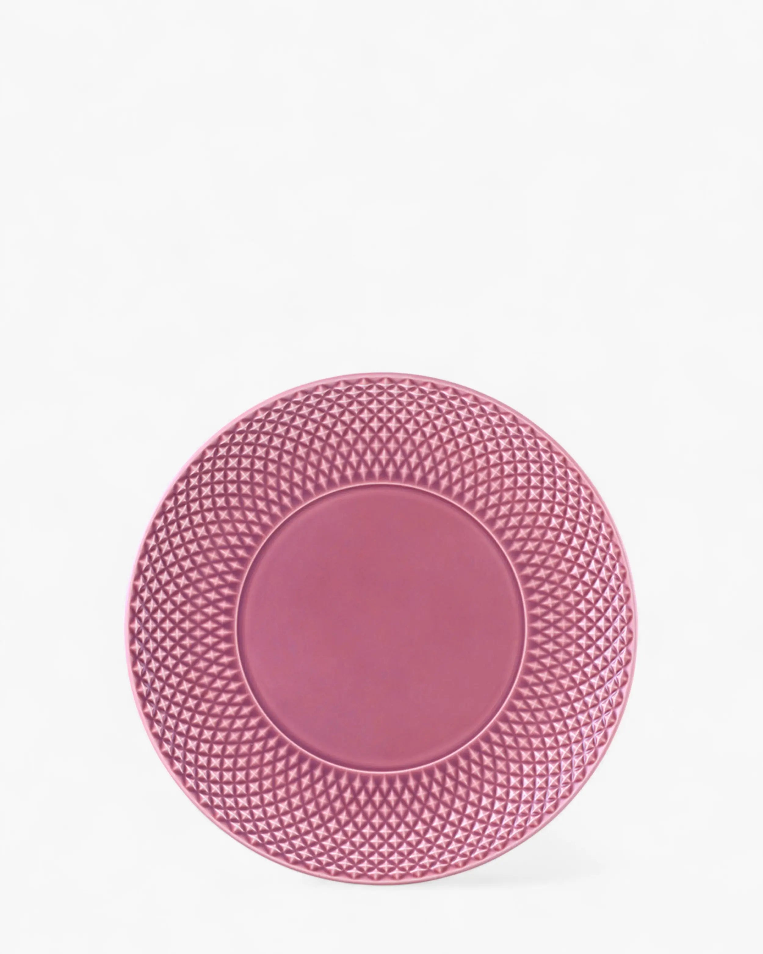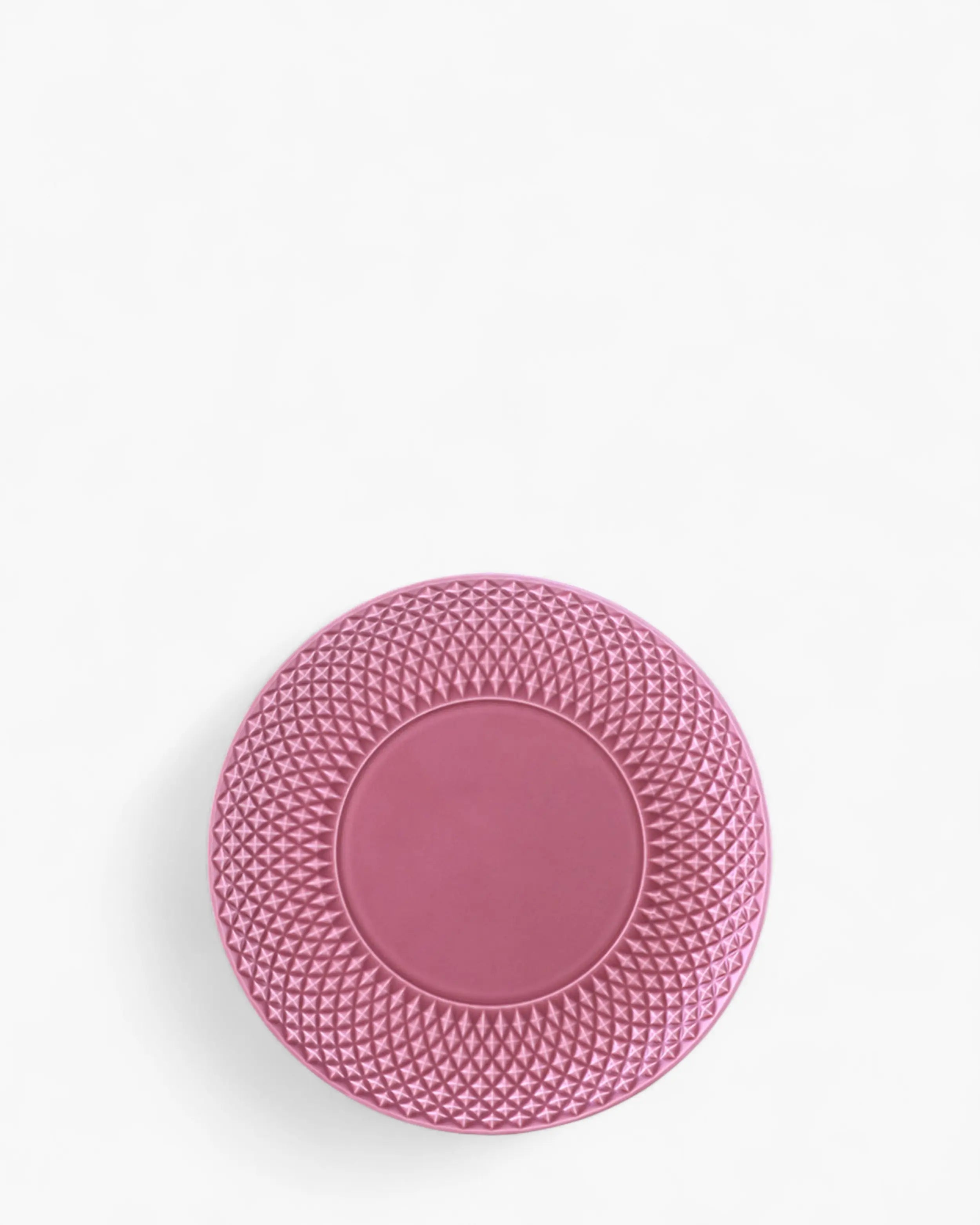 Because the collection is available in multiple diameters and a curated palette of Amber, Mineral Grey, Mint Green and Pink, you can design a table by mood: mineral and calm for weekday dinners, mint-fresh for spring parties, or amber to warm candlelight. Combine with matching bowls and salad pieces to build a complete setting, or mix across colours for a collected look. The faceted relief amplifies ingredients’ natural tones, so even simple recipes feel considered and photogenic in any light.