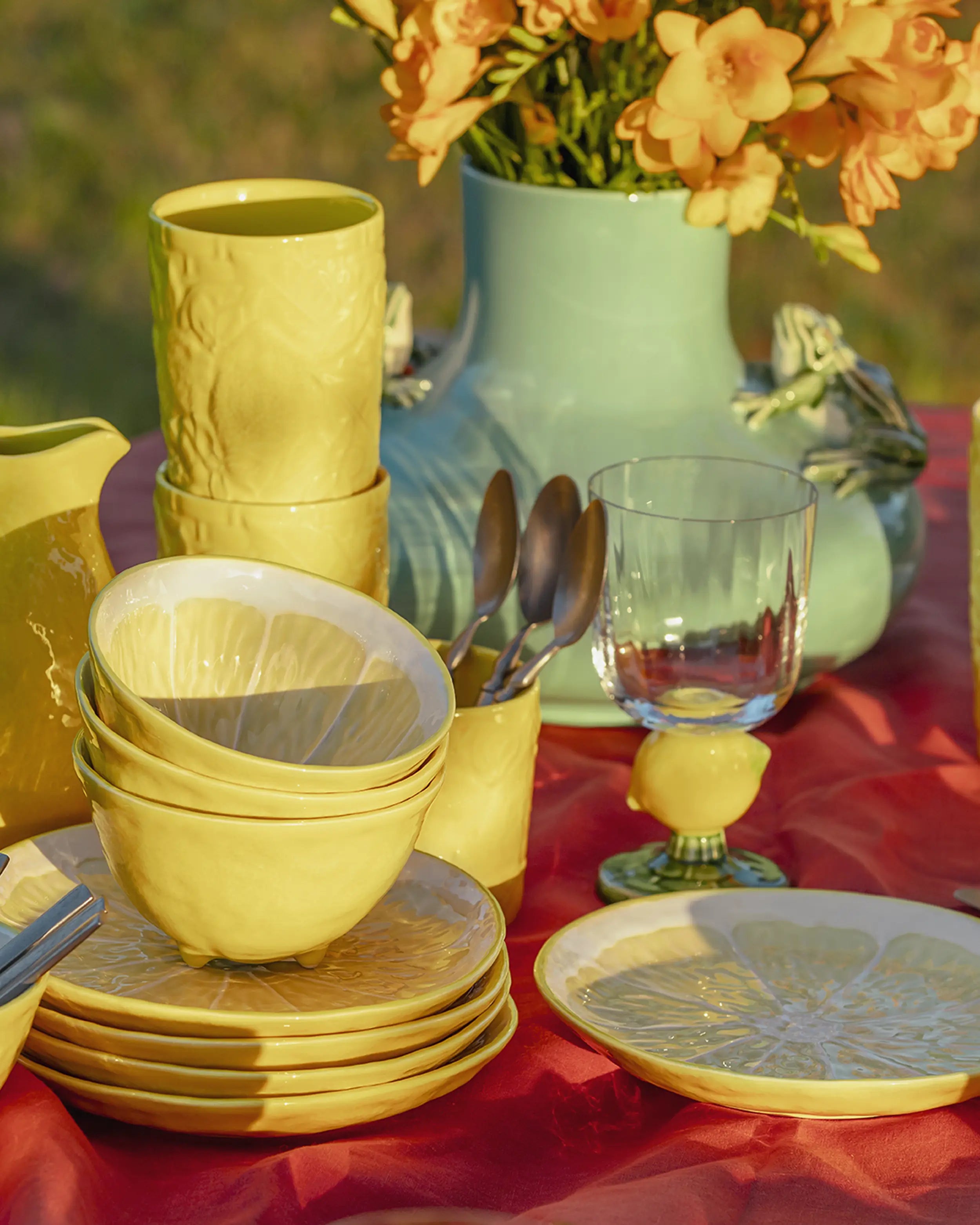 The Bordallo Pinheiro Lemon bowl is versatile in its use: serve olives, nuts, or sauces at casual gatherings, or let it act as a decorative accent on open shelves and dining consoles. Its compact size makes it perfect as part of layered place settings, while its sculptural form allows it to stand out even when used on its own. Combined with pitchers, salad bowls, and plates from the Lemon line, it helps create a cohesive and expressive service.