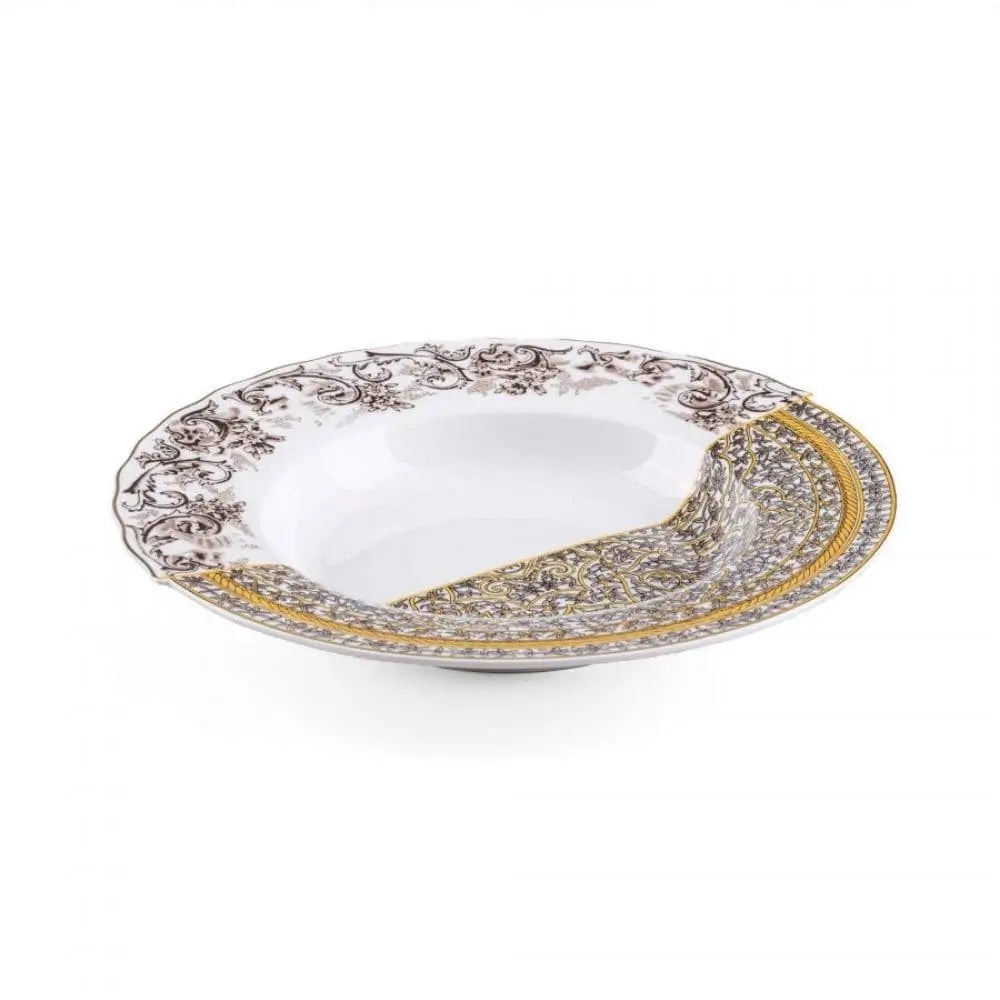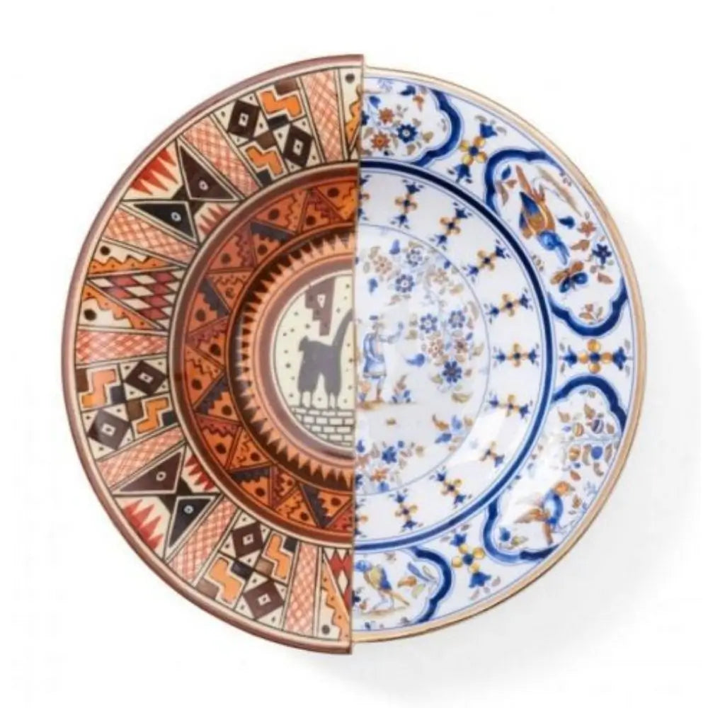 Made entirely from Bone China porcelain, celebrated for its strength, delicacy and luminous finish, the Seletti Hybrid porcelain soup plate is designed for alimentary use while presenting itself as a true collectible object. The split identity of the plate is not merely a stylistic touch; it is the essence of the Hybrid collection. One half references Western porcelain tradition through detailed motifs and classic geometries, while the other half embraces Eastern artistry through organic shapes and vibrant patterns. These opposing aesthetics meet along a carefully drawn dividing line, forming a visual axis that immediately captures attention. conceived by the globally recognised CtrlZak and Seletti partnership, the piece belongs simultaneously to the Seletti's Tableware line and the wider Seletti Hybrid collection, a trio that has redefined contemporary tableware by merging narrative design, cultural heritage and modern craftsmanship into a single expressive philosophy.A Contemporary Plate for Bold and Eclectic Tables