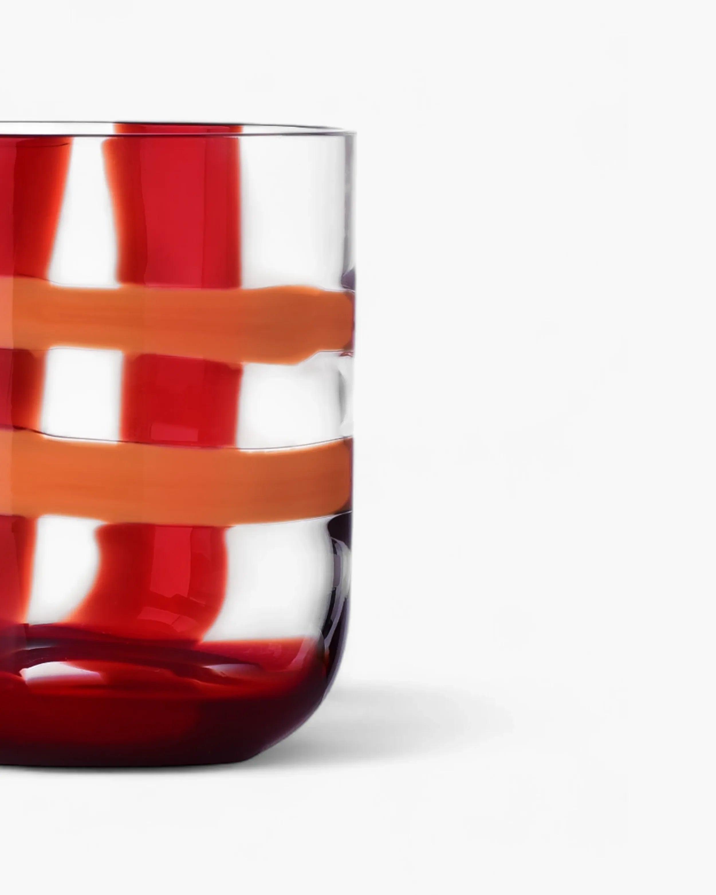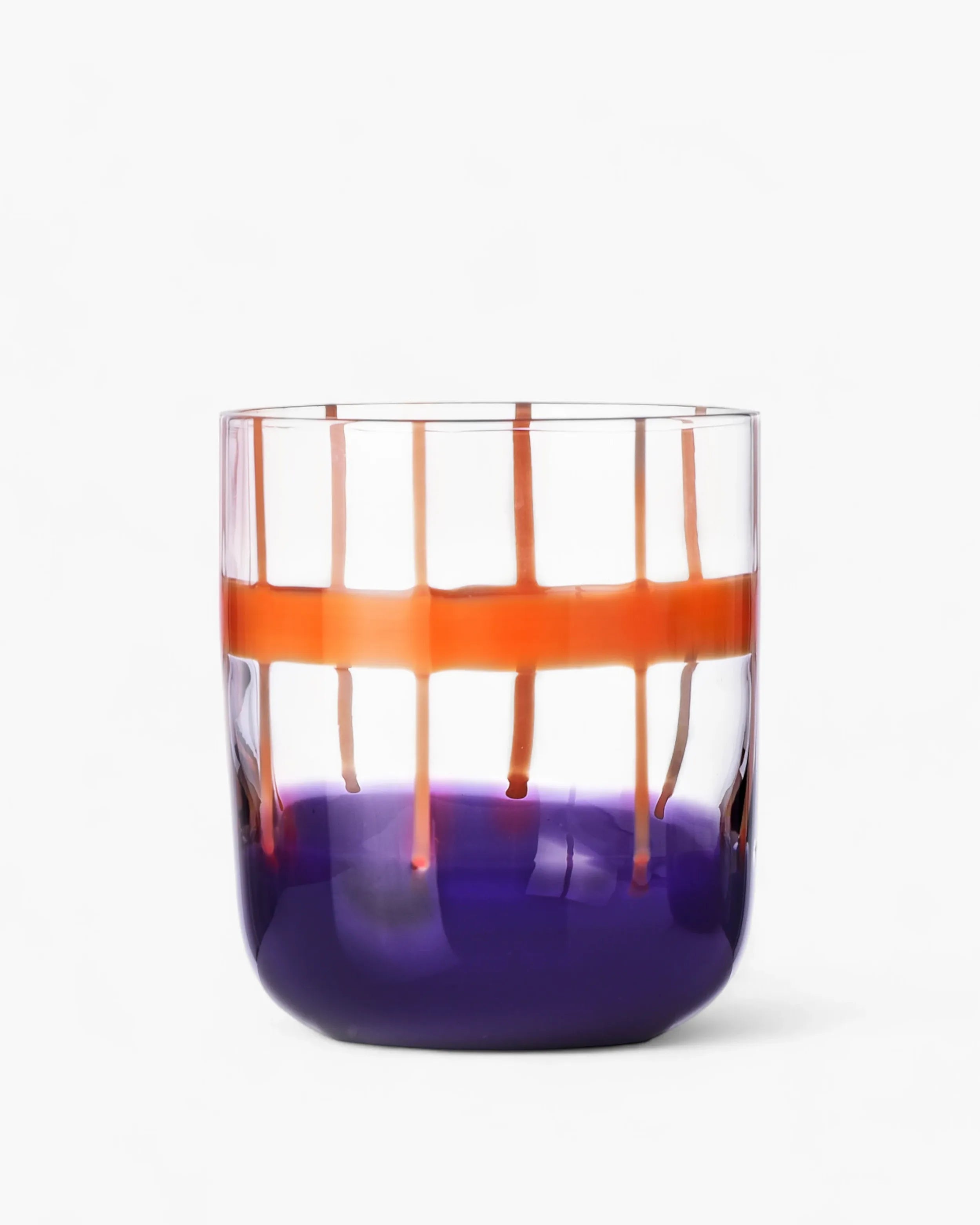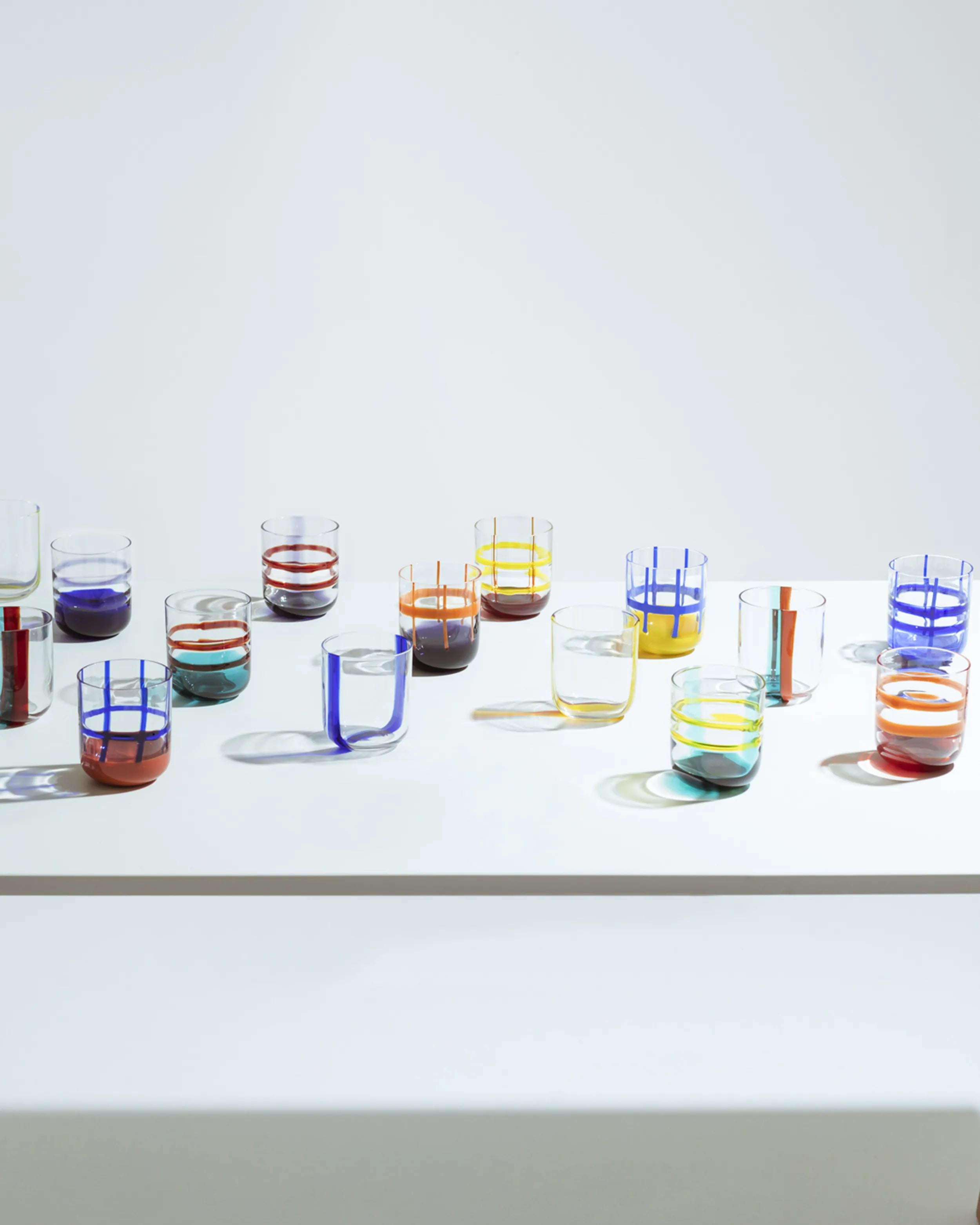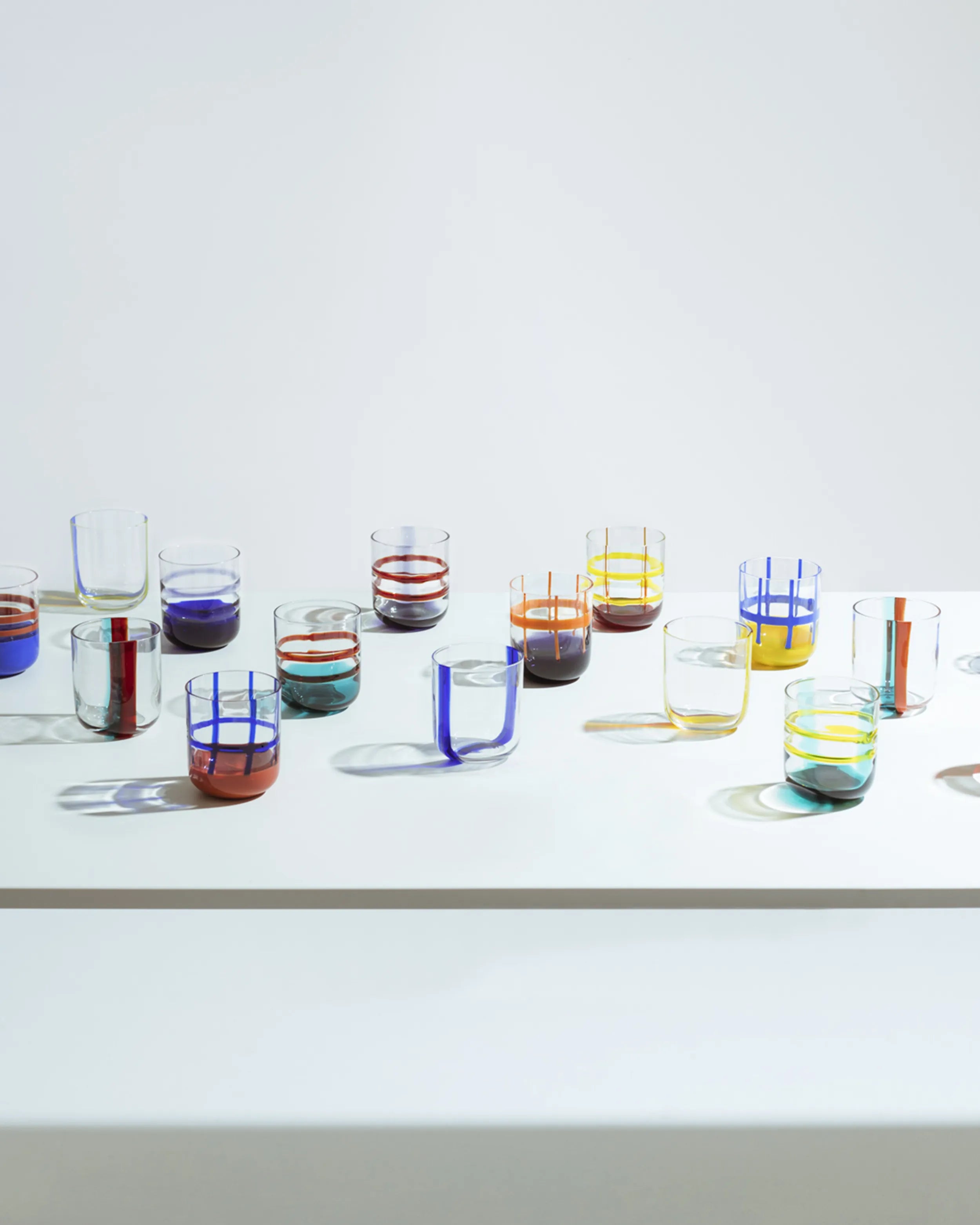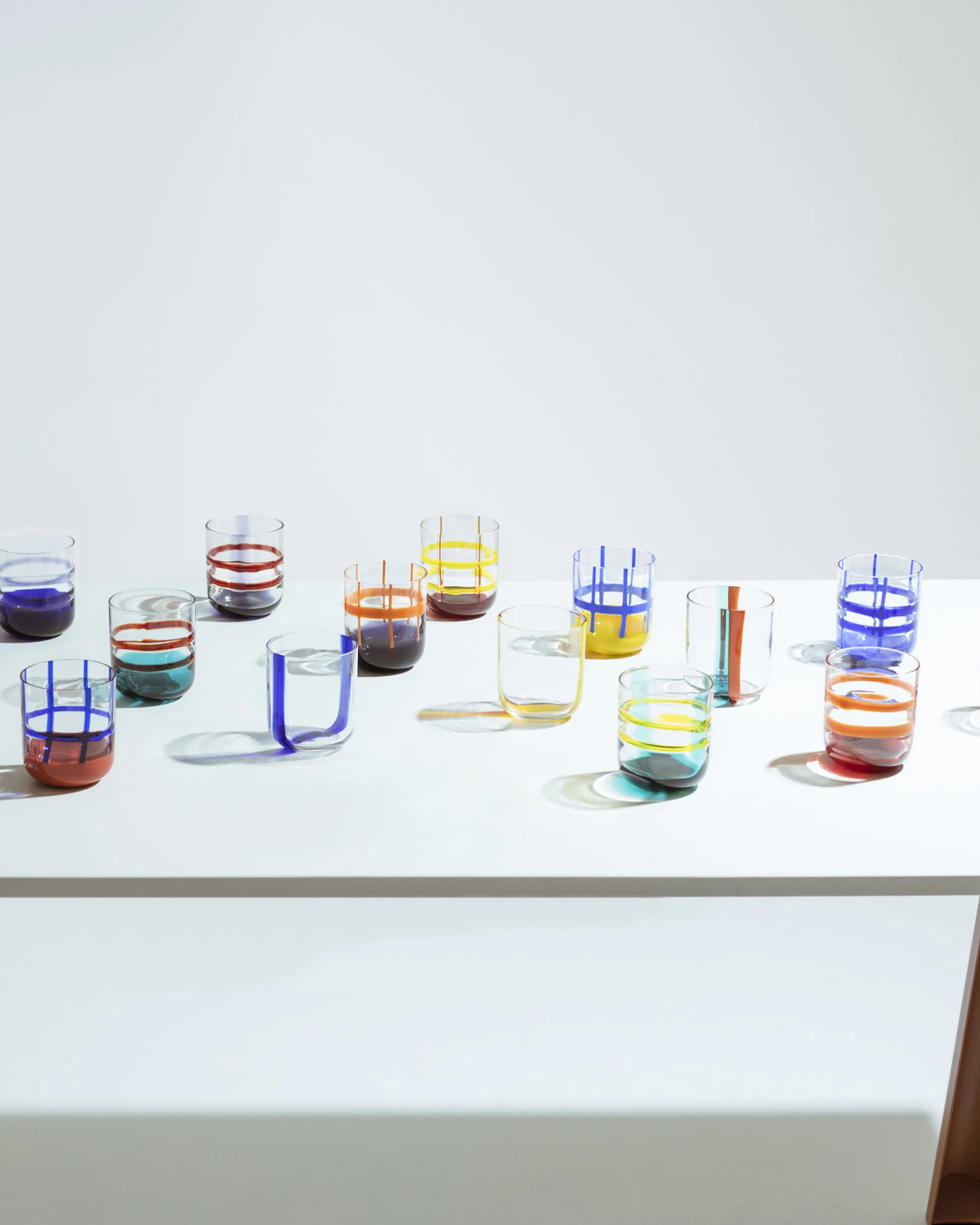 From deep burgundy and orange to turquoise, lilac, and light blue, the palette of this handmade striped glass collection celebrates the harmony between precision and spontaneity. The fusion of tones highlights Ichendorf's approach to contemporary glass design: playful, modern, and sophisticated. Both decorative and practical, the artistic colorful drinkware is ideal for water, cocktails, or simply as an accent piece that enlivens any setting with its sculptural presence. Each tumbler bears the mark of human touch and the lightness of Italian craftsmanship.