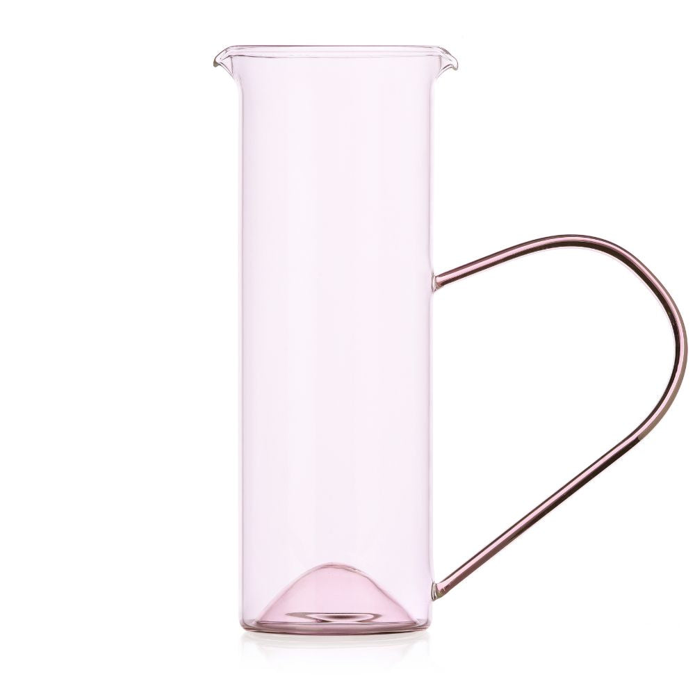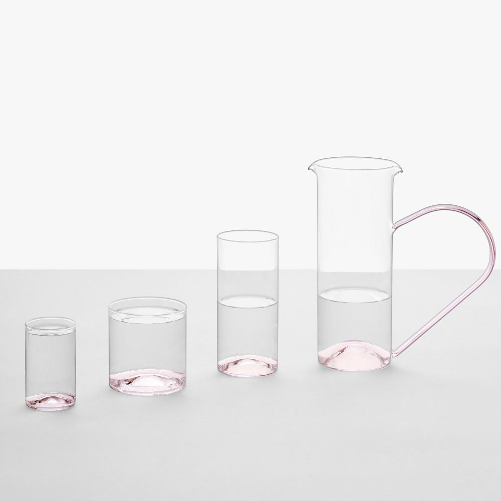 Made of handmade and lampworked borosilicate glass, the Ichendorf carafe is imbued with a soft pink hue that seems to blend naturally with its minimal geometry. Borosilicate’s clarity allows the tint to appear lightweight and luminous, while offering the strength and resilience needed for actual daily use. Available in two heights (22 cm and 25.5 cm) the carafe maintains the same poised tilt in both versions. The collection’s characteristics confirm suitability for alimentary use and low-temperature dishwasher cycles, ensuring that this expressive design remains practical and easy to handle.