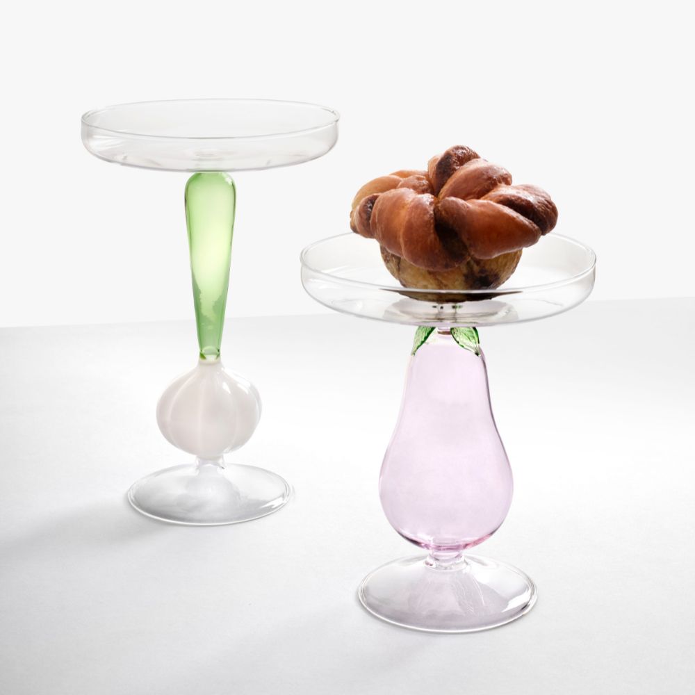 Its pedestal structure lifts what it holds, allowing light to pass through and cast soft reflections on the table. This gives the plate a natural ability to highlight food or decorative accents placed upon it, making it equally suitable for hosting delicate desserts or acting as a centrepiece on a dining table or sideboard. When paired with minimalist glass tumblers or colourful Alessandra Baldereschi's design pieces, it contributes to a table setting that feels expressive, harmonious and full of character.