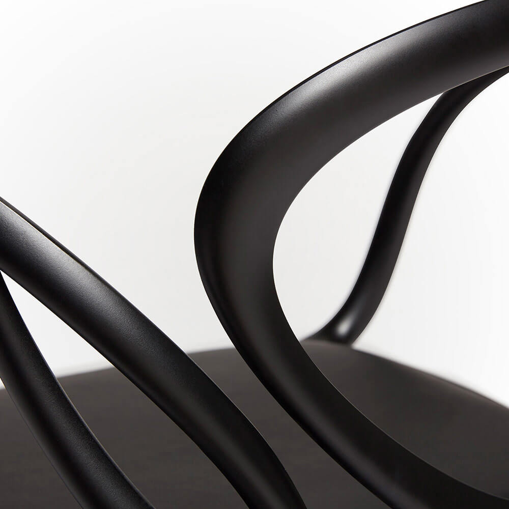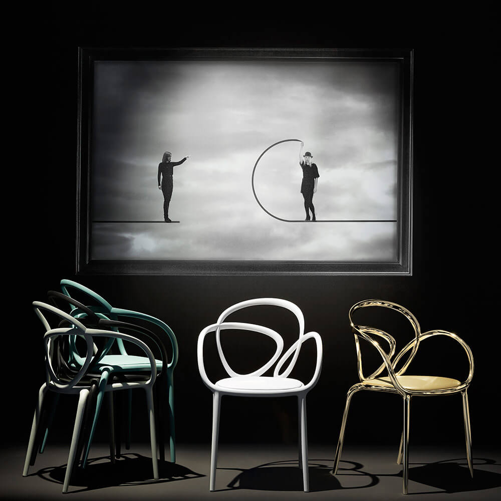 Loop 兩張椅子組合提供經典的黑色的與白色的選擇,採用簡約的色彩策略,突顯設計的純粹性。黑色的強化了形態的圖像張力與雕塑深度,而白色的則強調輕盈與連續感。這種克制的色彩組合使椅子能無縫融入各種室內風格,從極簡餐區到更具表現力的當代空間。搭配Qeeboo 桌子系列的元素,椅子共同營造出和諧且均衡的用餐環境。