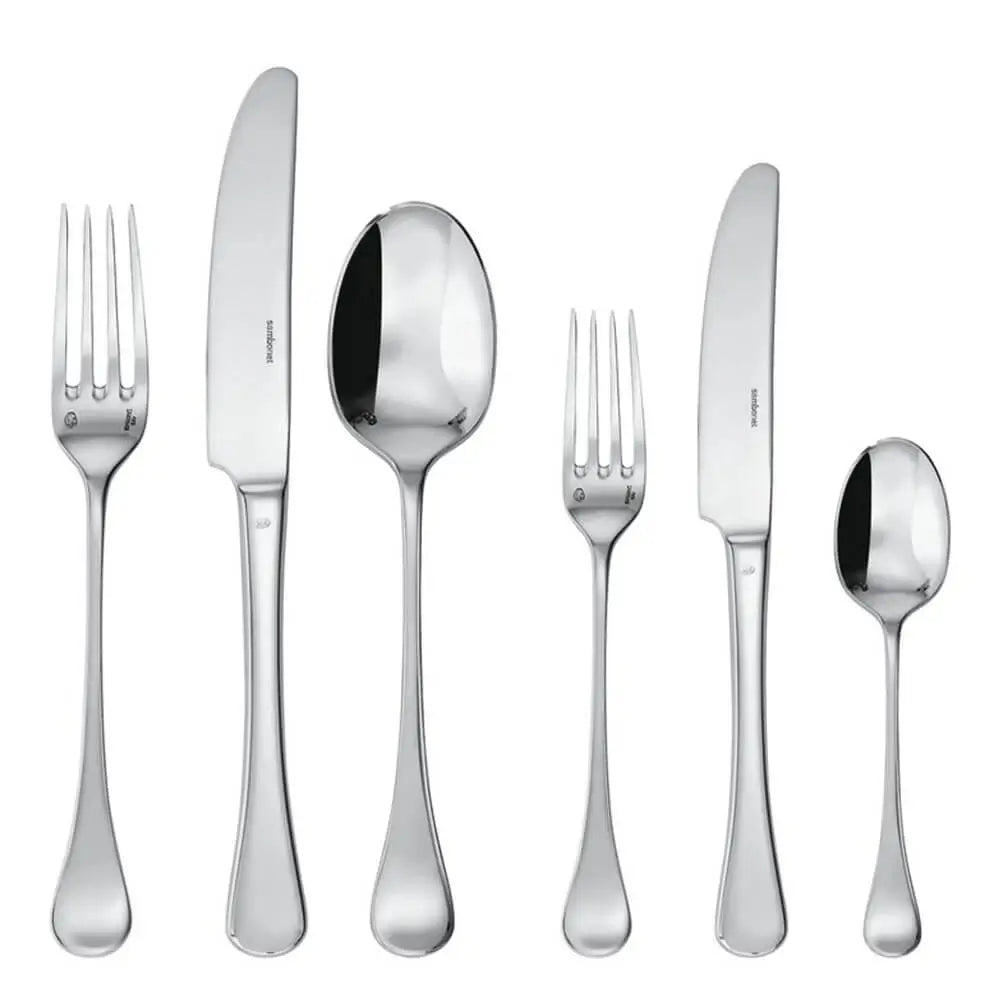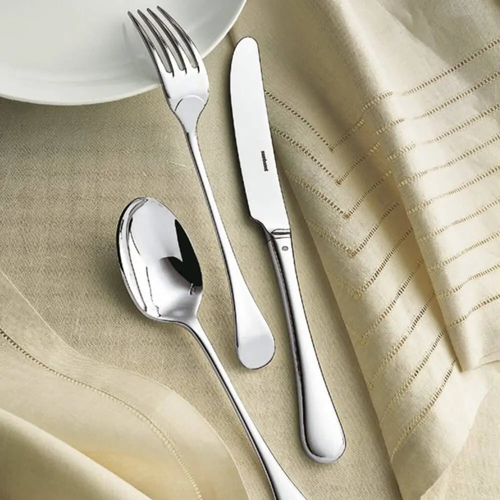 由Sambonet製造,此套組展現品牌長期致力於精緻餐具製造的承諾。拋光不鏽鋼表面在微彎的握柄上捕捉光線,強化設計的裝飾節奏,同時保持日常使用的耐用性。每件餐具均經過人體工學設計,確保握柄與功能端的平衡,提供長時間用餐的舒適感。作為傳統精緻用餐餐具系列的一部分,整體體現工藝傳統與現代生產卓越的連續性。