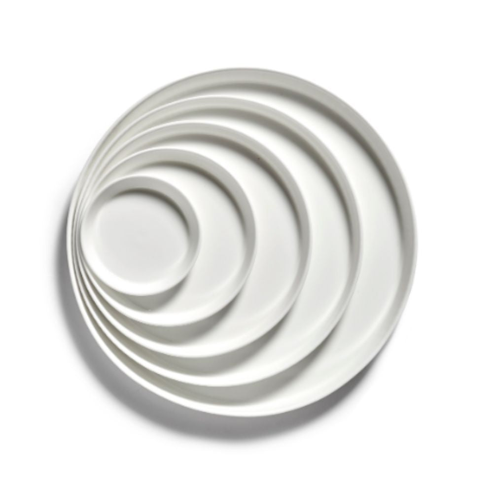 Fully dishwasher safe and designed for alimentary use, this collection merges practicality with poetic precision. The 6cm bread plate with raised edge and larger versions are lightweight yet sturdy, embodying the tactile finesse of true craftsmanship. The purity of Bone China porcelain gives each piece a subtle translucency, while the fine rim and elevated contour highlight its sculptural essence. Perfect for contemporary interiors, the plate pairs beautifully with crystal glasses and polished steel utensils from Serax Cutlery.